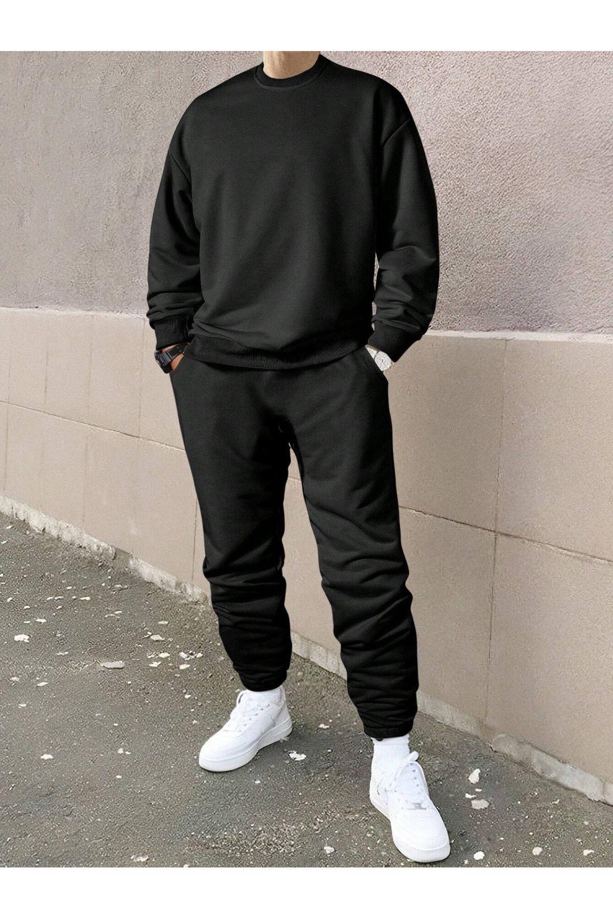 Erkek Düz Eşofman Takımı Sweatshirt Jogger - Siyah Oversize Şardonlu Bisiklet Yaka