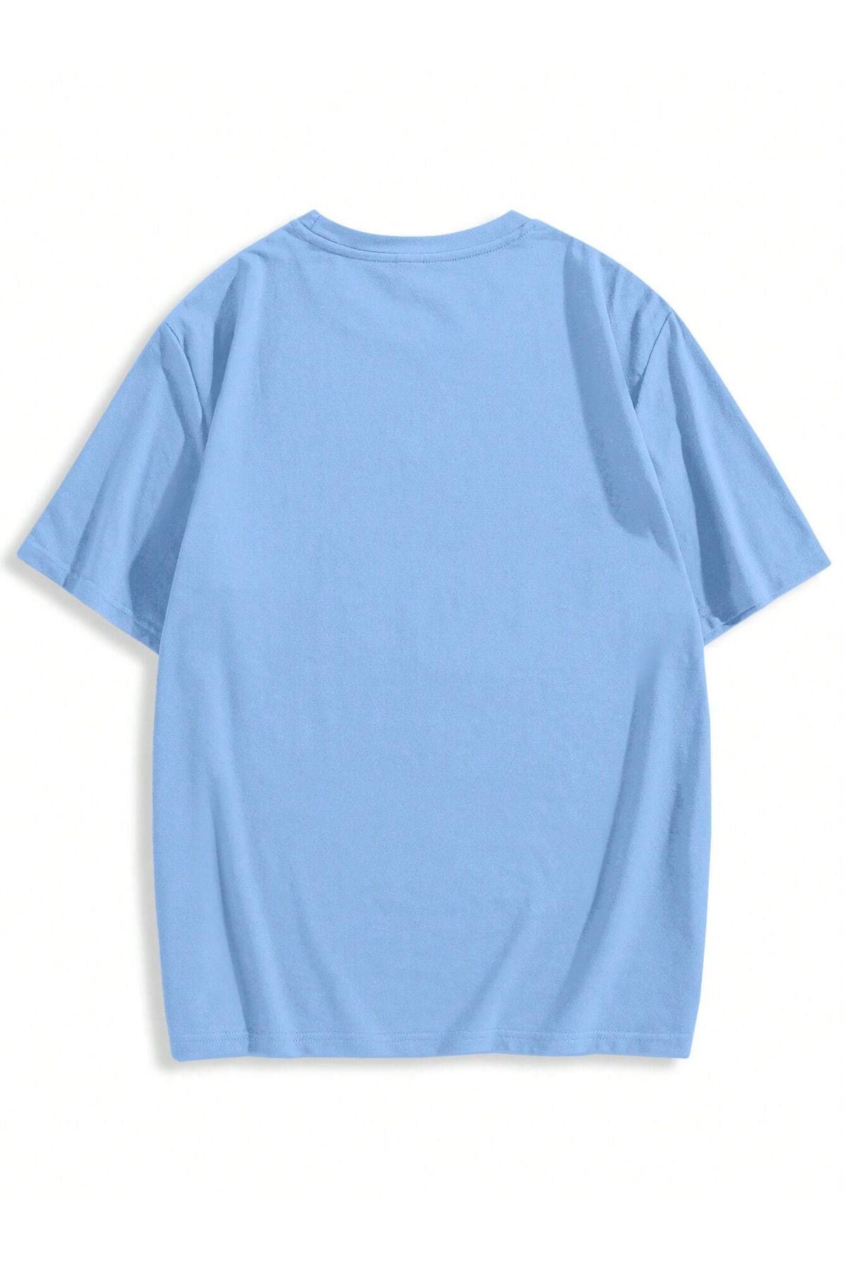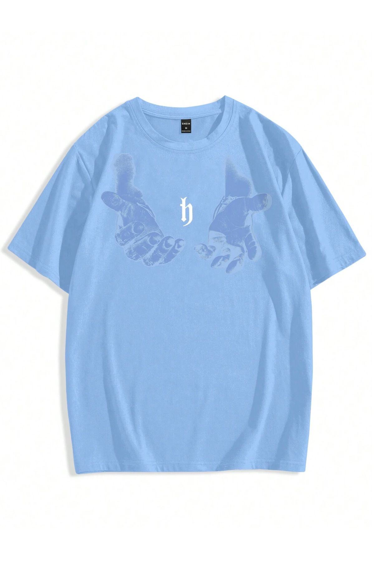 Erkek El Baskı Oversize Bebe Mavi Baskılı T-shirt - Bisiklet Yaka Kısa Kol Rahat Kalıp Tişört