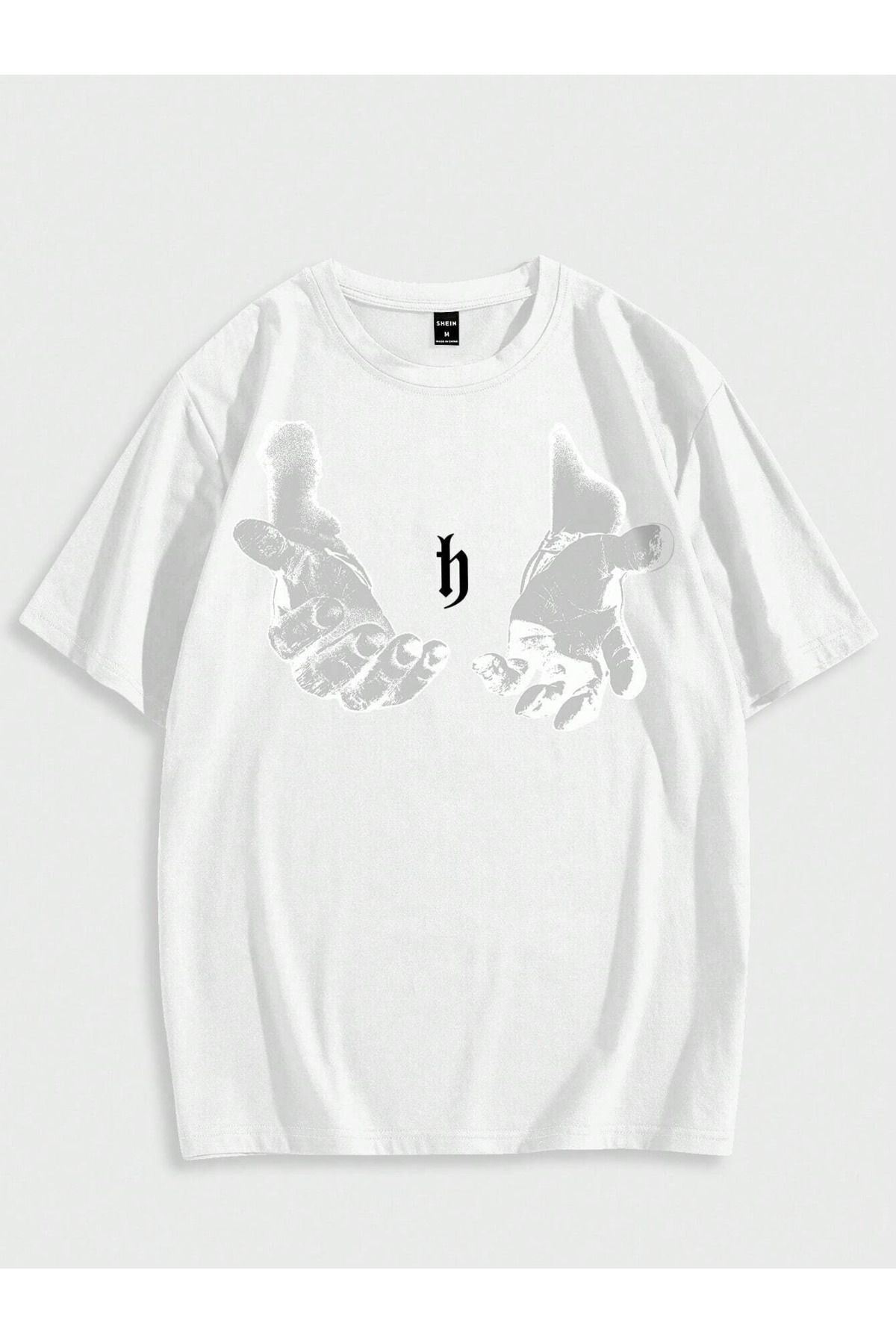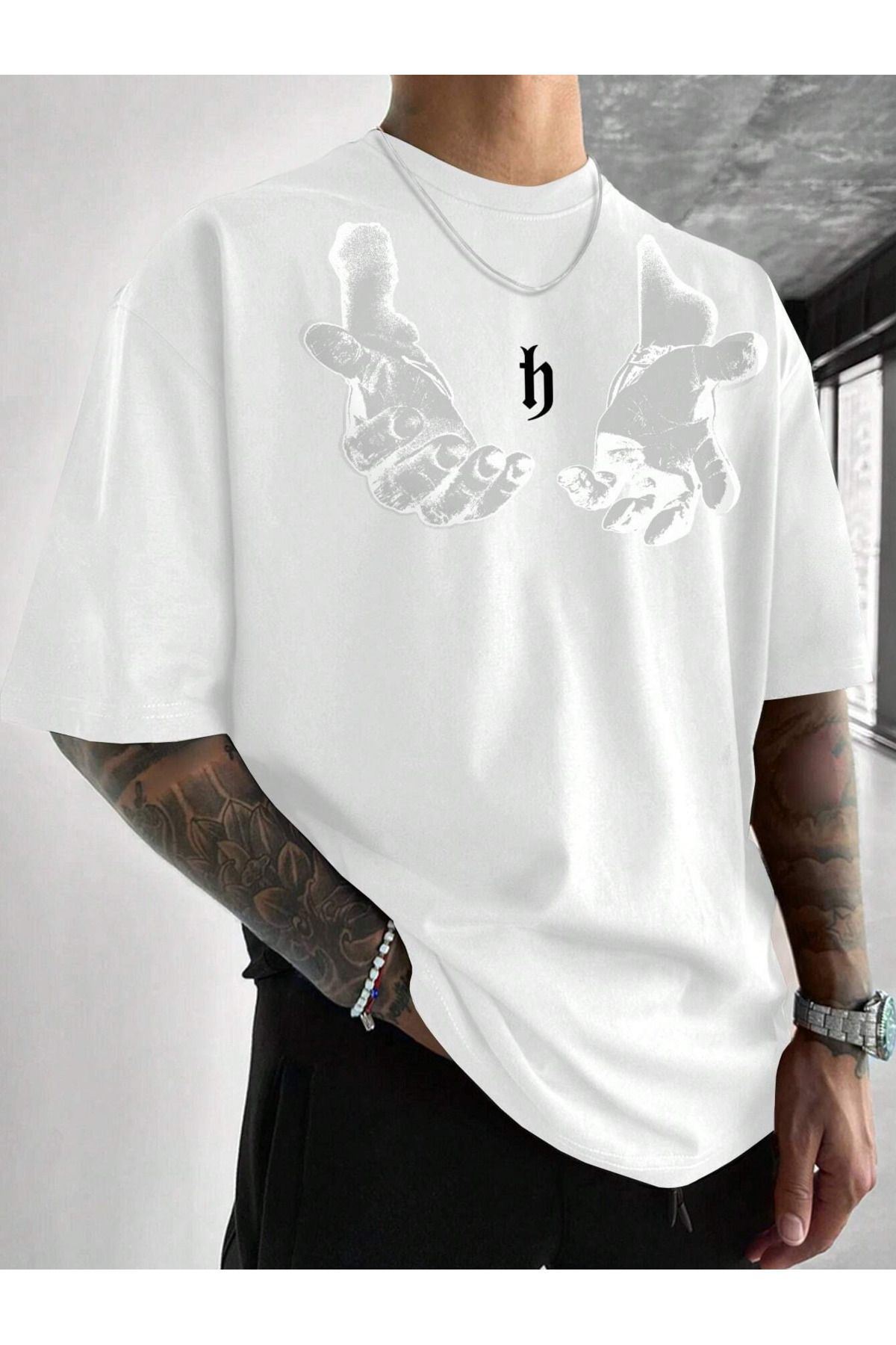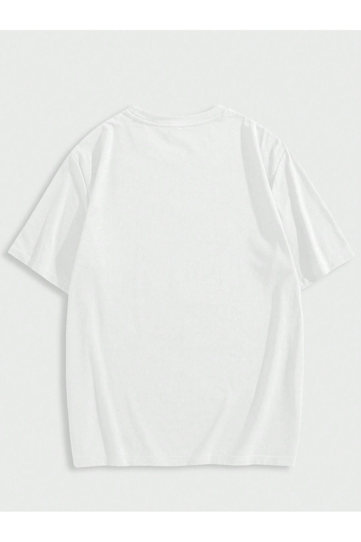 Erkek El Baskı Oversize Beyaz Baskılı T-shirt - Bisiklet Yaka Kısa Kol Rahat Kalıp Tişört