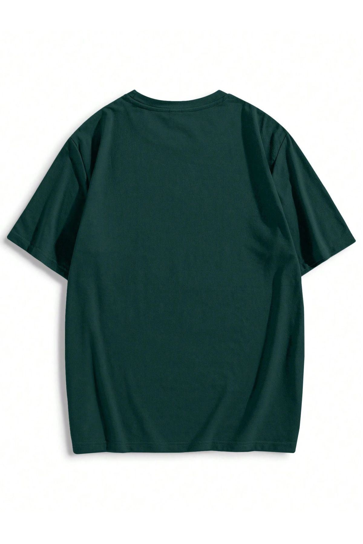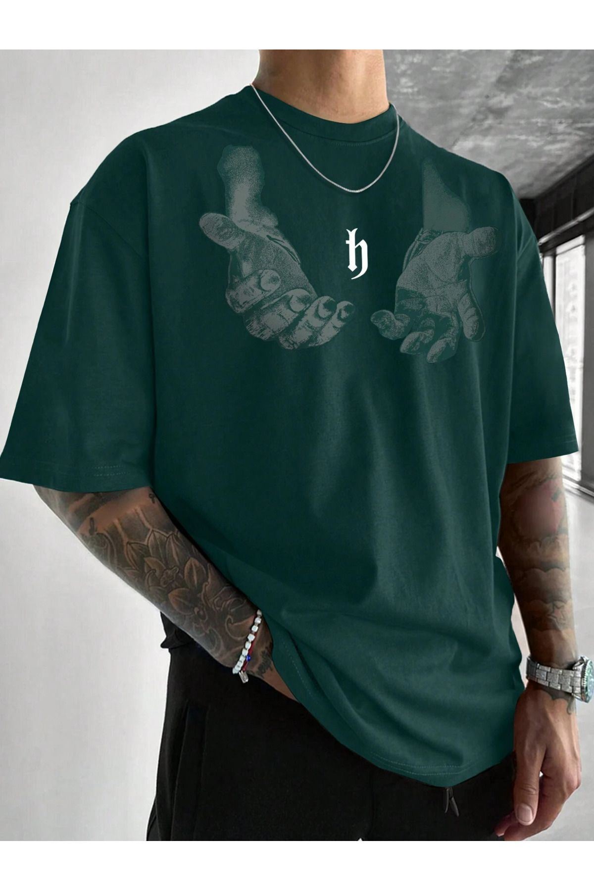Erkek El Baskı Oversize Nefti Yeşil Baskılı T-shirt - Bisiklet Yaka Kısa Kol Rahat Kalıp Tişört
