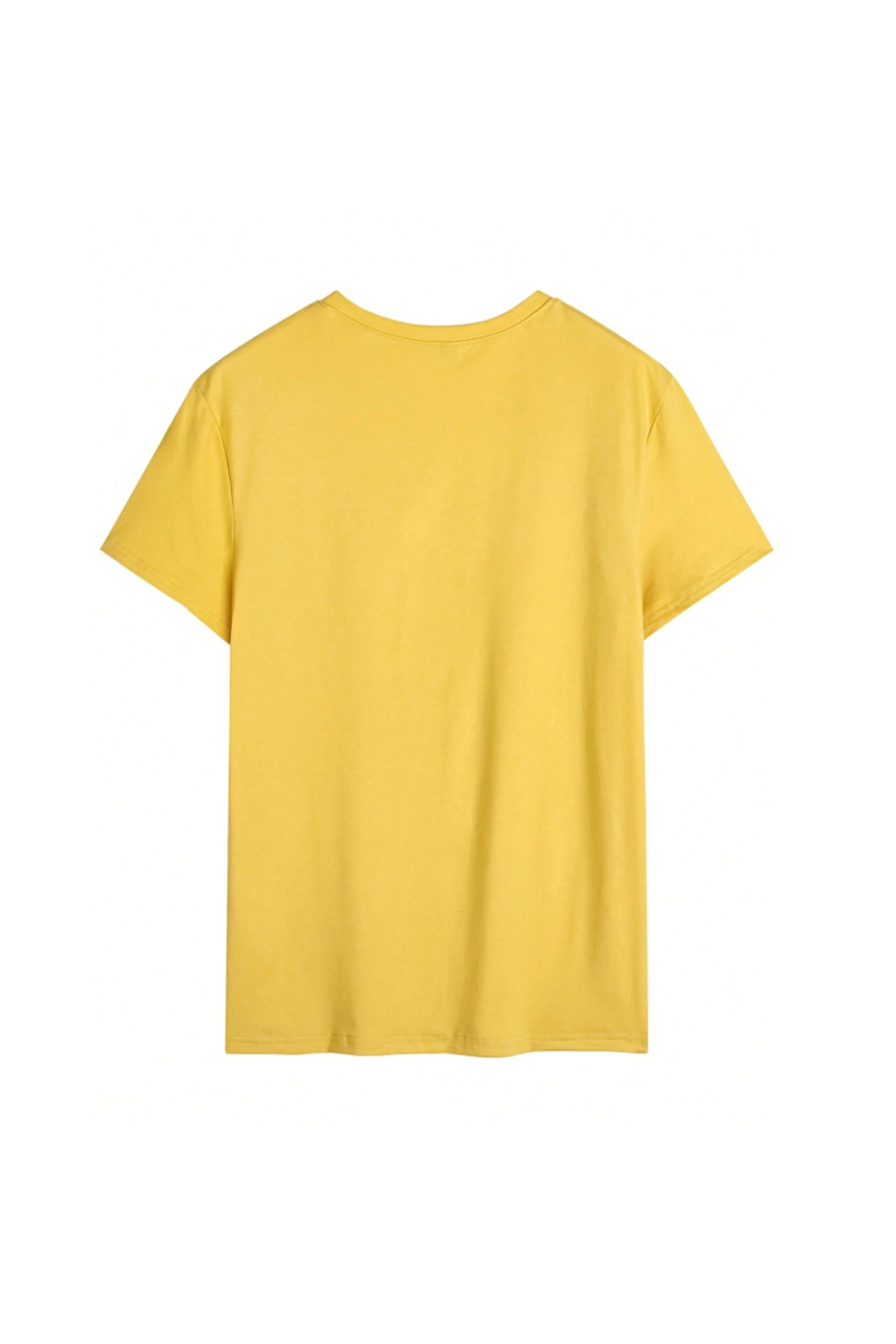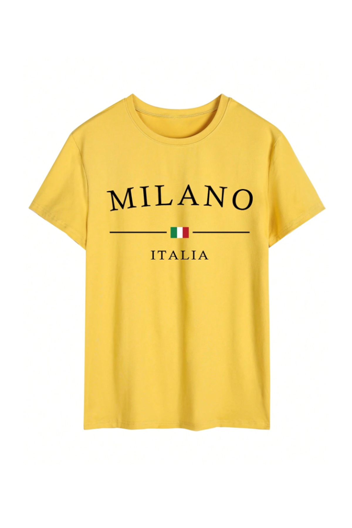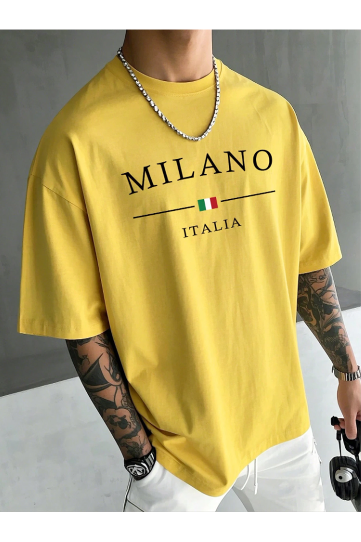 Erkek Oversize Milano Italia Baskılı Sarı Tişört - Yazlık Şık Stil
