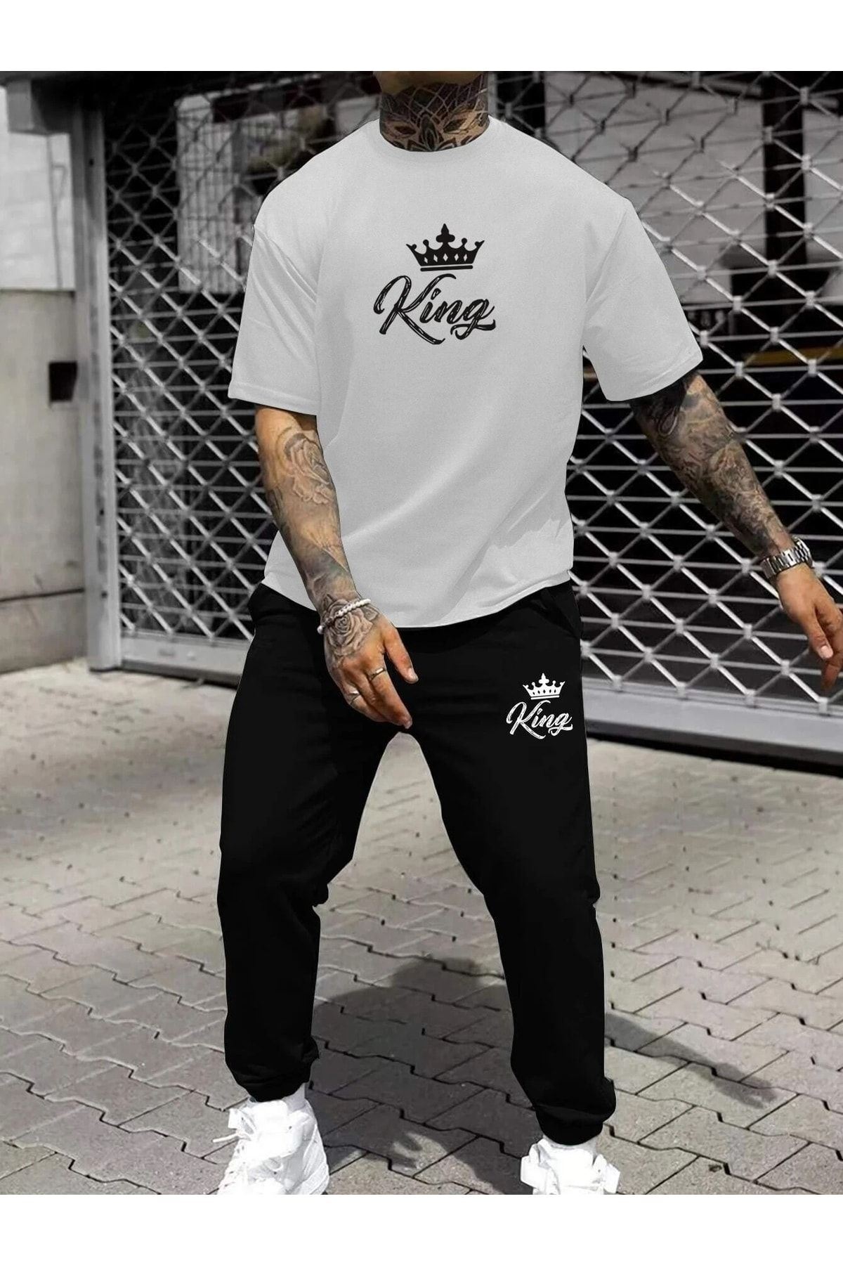 Erkek Siyah Eşofman&beyaz Tişört Takımı Kıng Baskılı Oversize Unisex