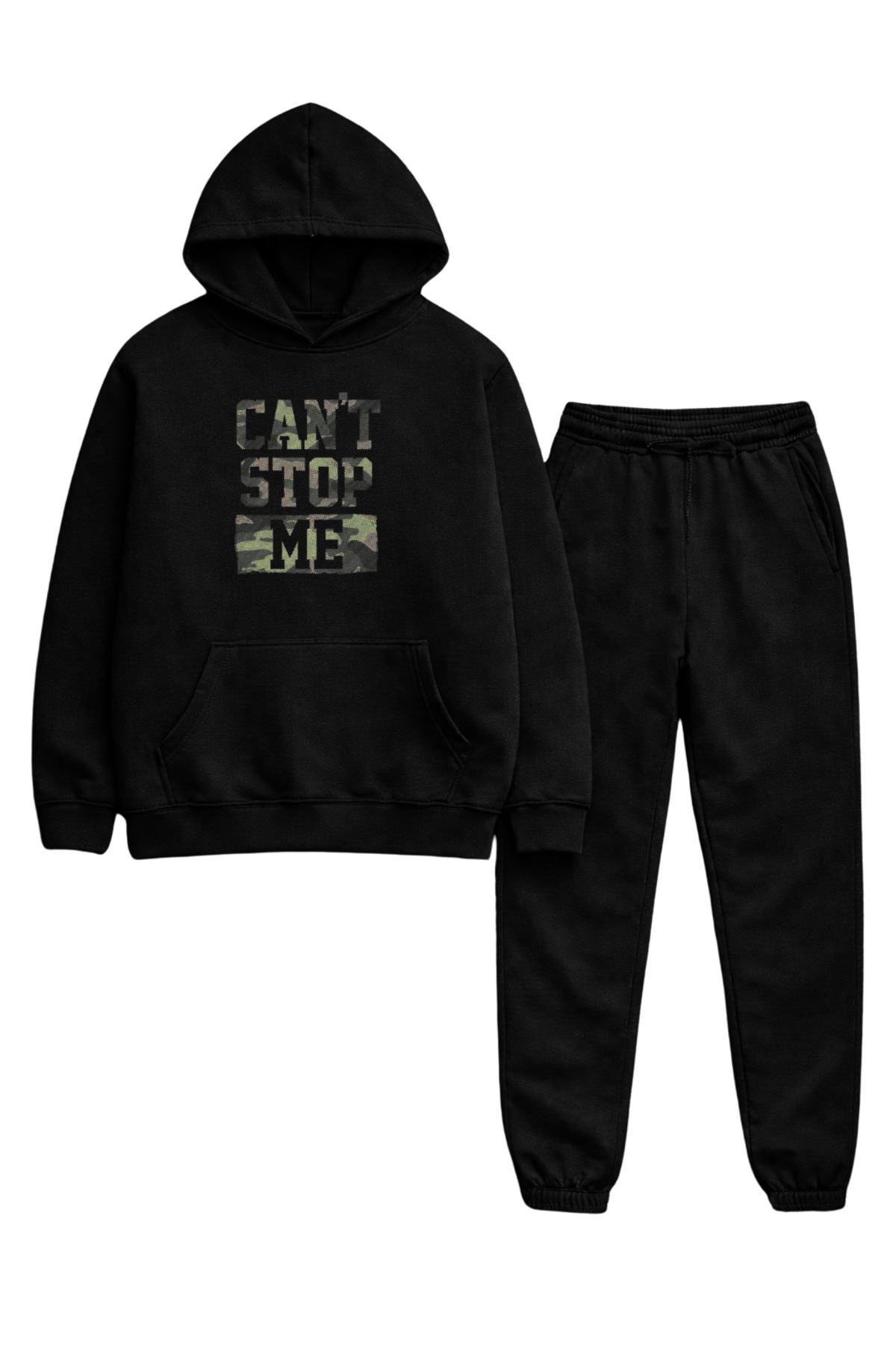 Şıklık ve konforu bir arada sunan erkek siyah kapüşonlu eşofman takımı, günlük kullanım ve spor kombinler için ideal tasarıma sahiptir. Üzerindeki modern “Can’t Stop Me” baskısı ile dinamik bir stil sunarken, lastik paçalı jogger altı sayesinde rahat bir kullanım sağlar.