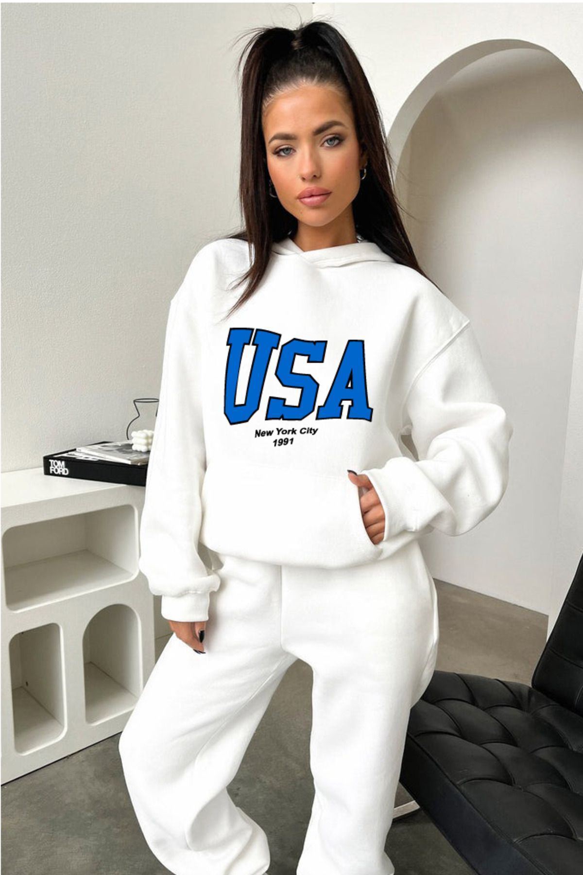 Eşofman Takımı Sweatshirt Jogger - Beyaz Baskılı Oversize Şardonlu Kapüşonlu