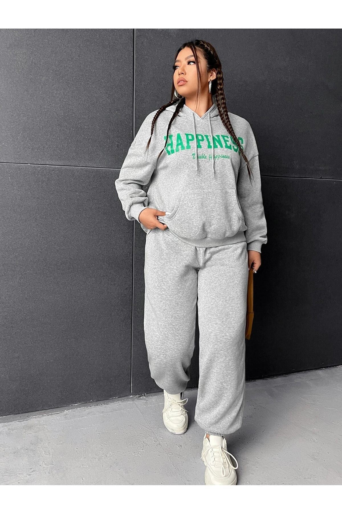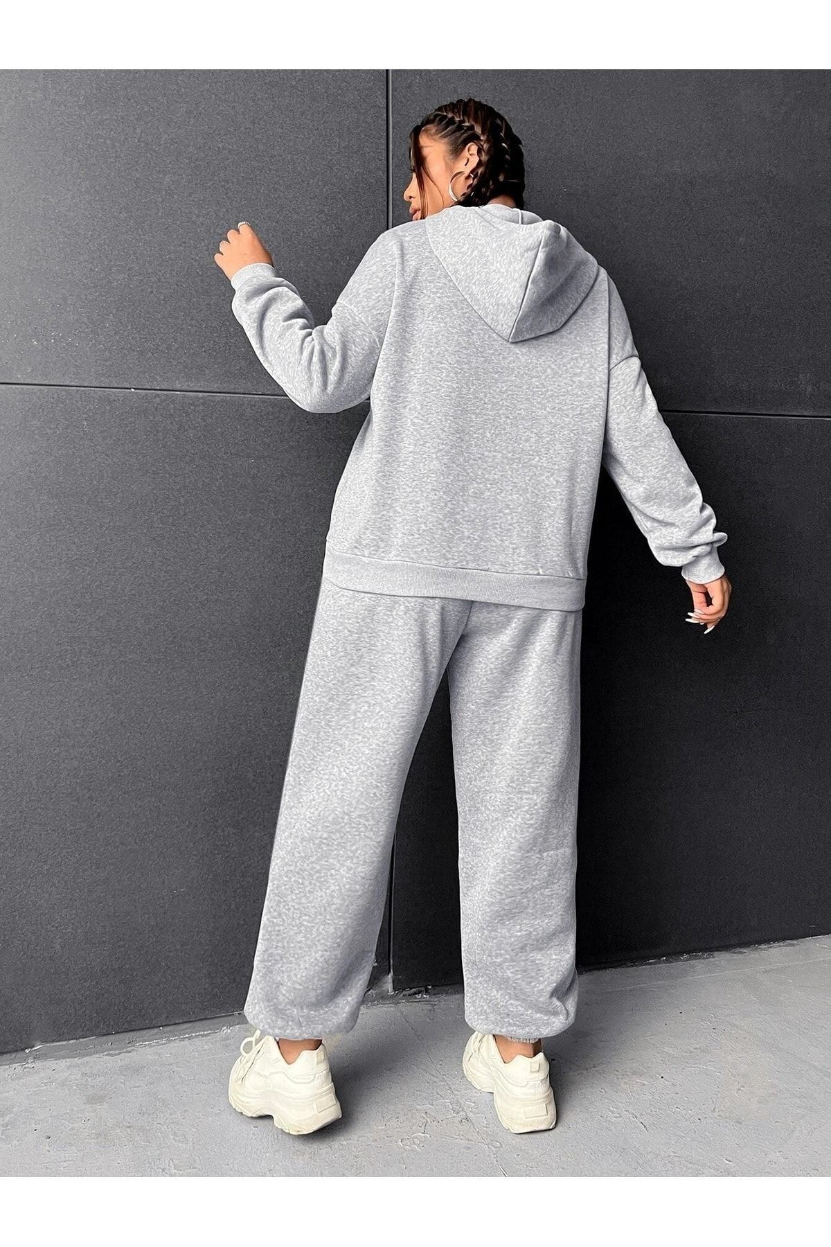 Eşofman Takımı Sweatshirt Jogger - Gri Baskılı Oversize Şardonlu Kapüşonlu
