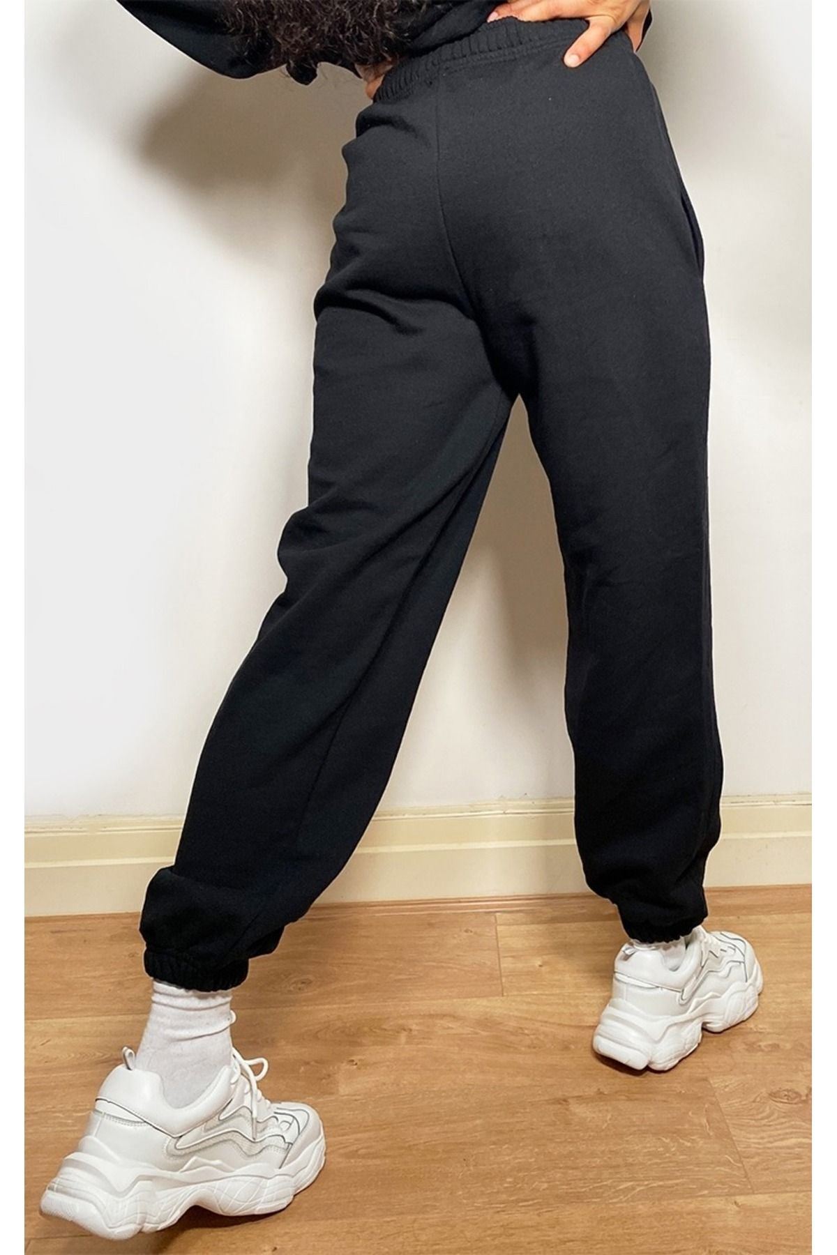 Eşofman Takımı Sweatshirt Jogger - Siyah Baskılı Oversize Şardonlu Bisiklet Yaka