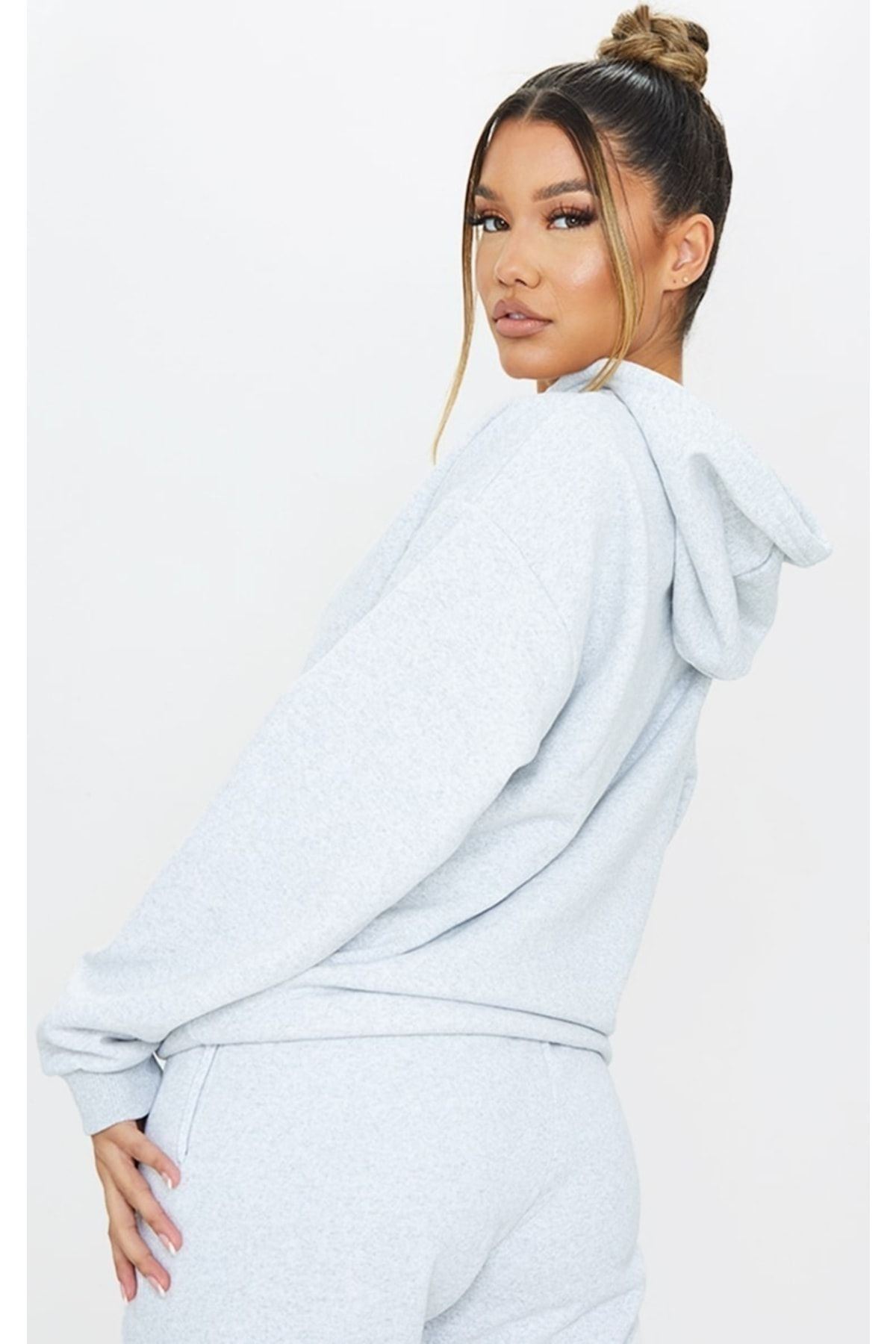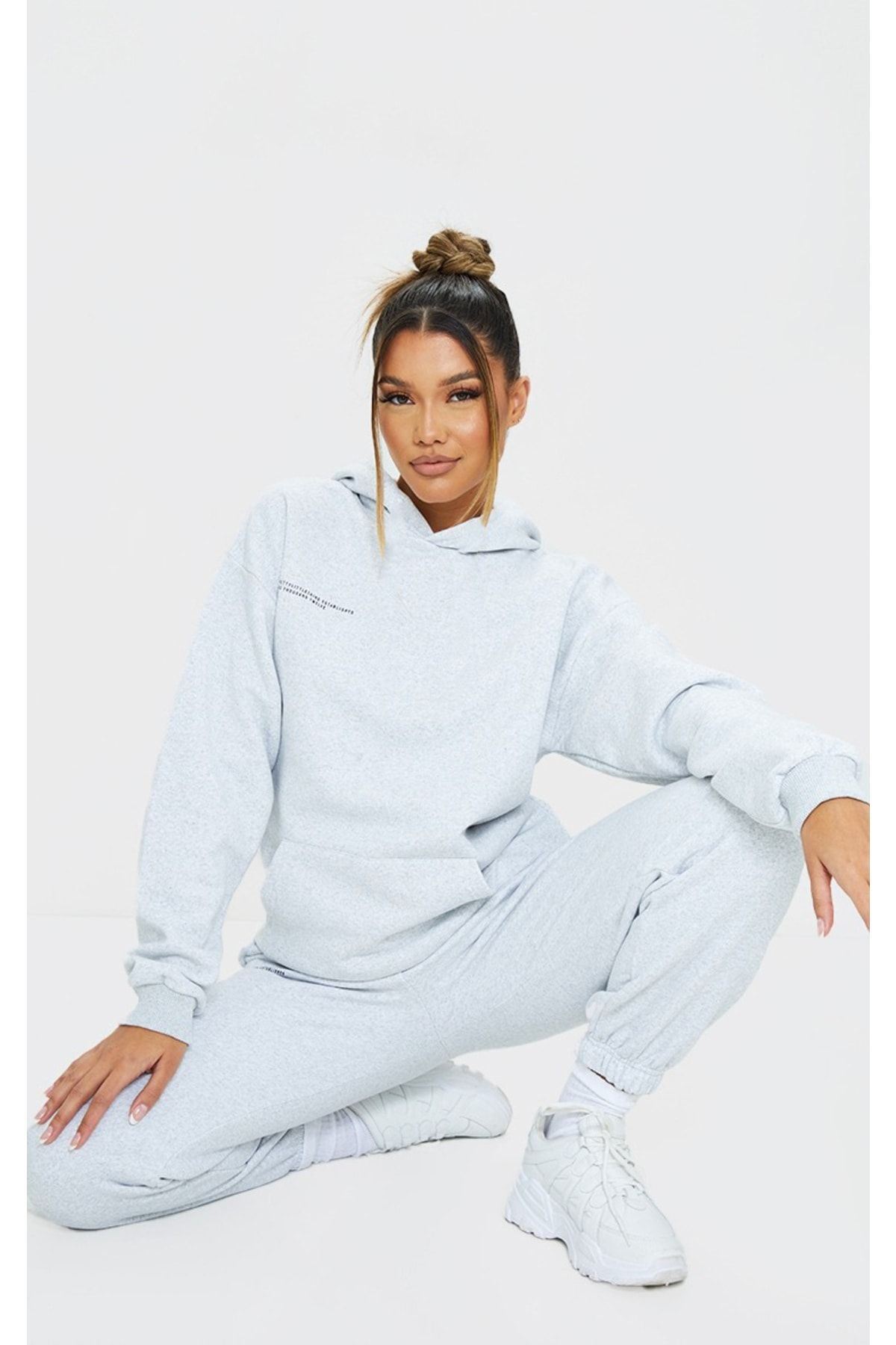 Established Eşofman Takımı Sweatshirt Jogger - Gri Baskılı Oversize Şardonlu Kapüşonlu Lastik Paça