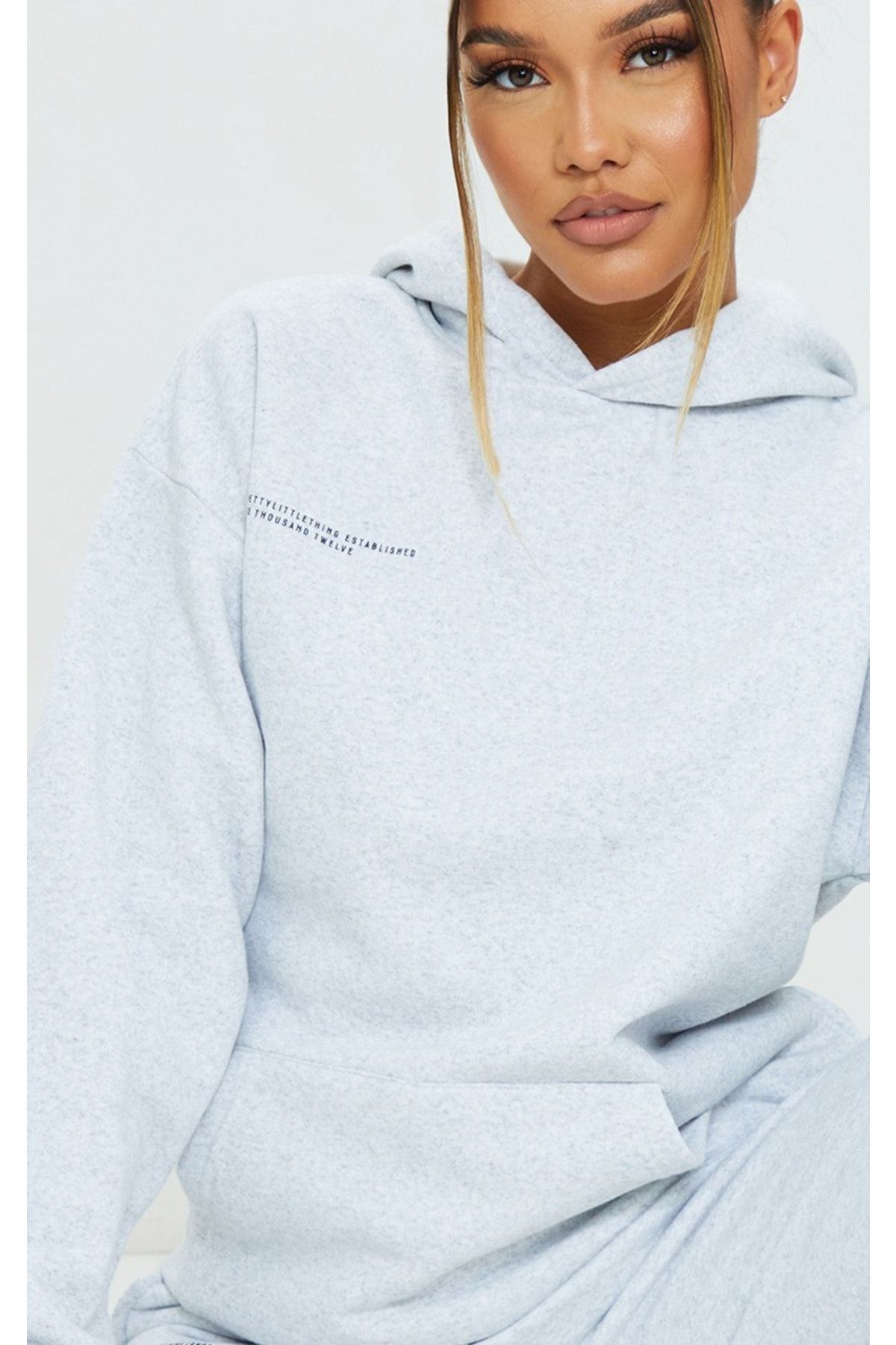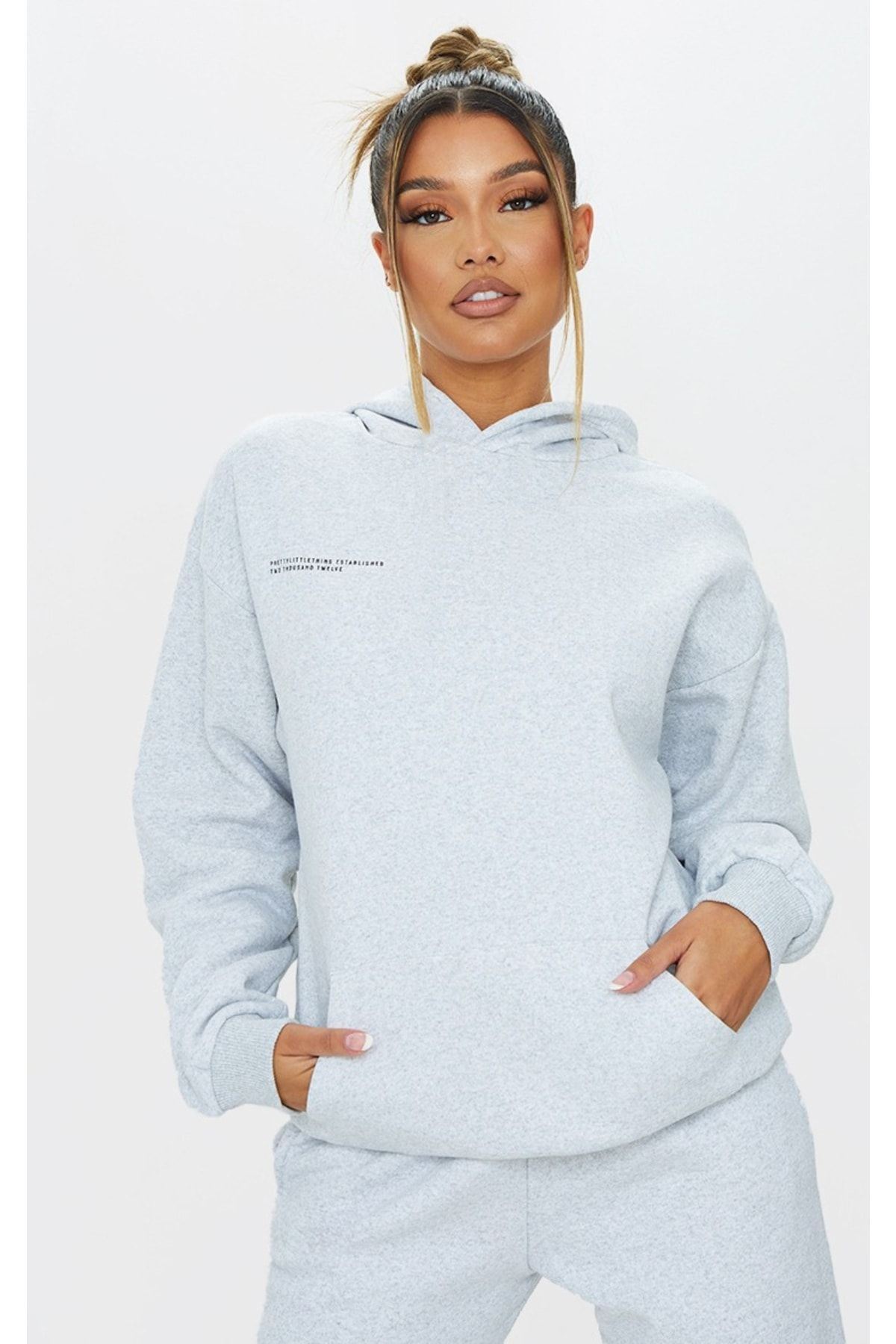 Established Eşofman Takımı Sweatshirt Jogger - Gri Baskılı Oversize Şardonlu Kapüşonlu Lastik Paça