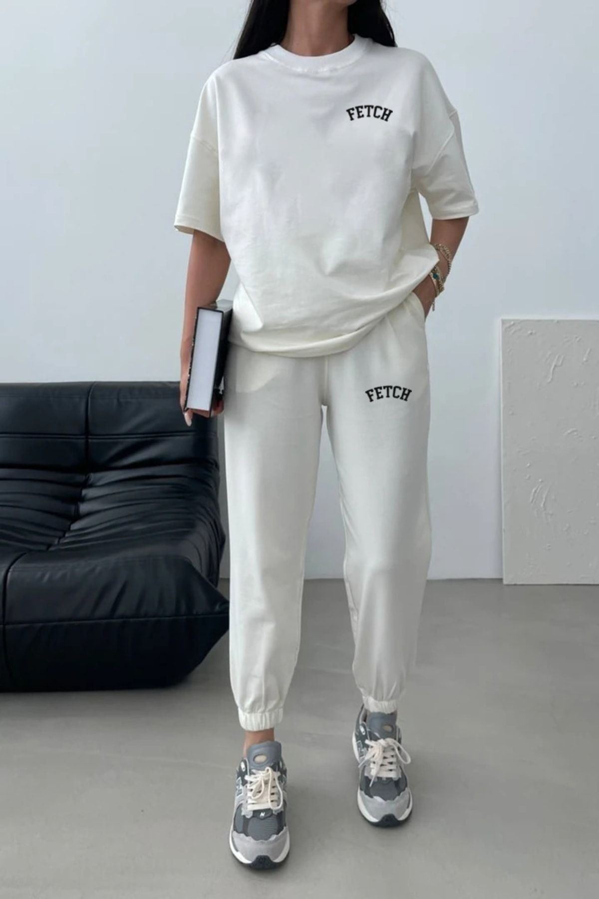 Fetch T-Shirt Eşofman Altı Jogger- Beyaz Baskı Alt Üst Eşofman Takımı Oversize Bisiklet Yaka