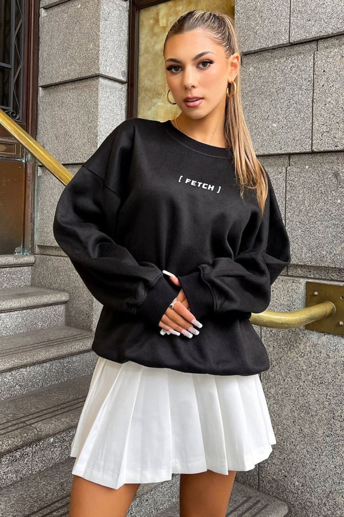 Fetch Tasarım Sweatshirt - Siyah Baskılı Oversize Bisiklet Yaka
