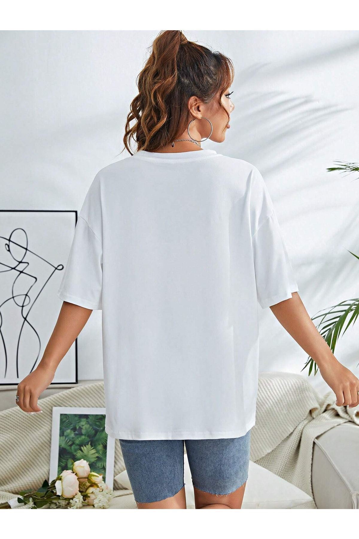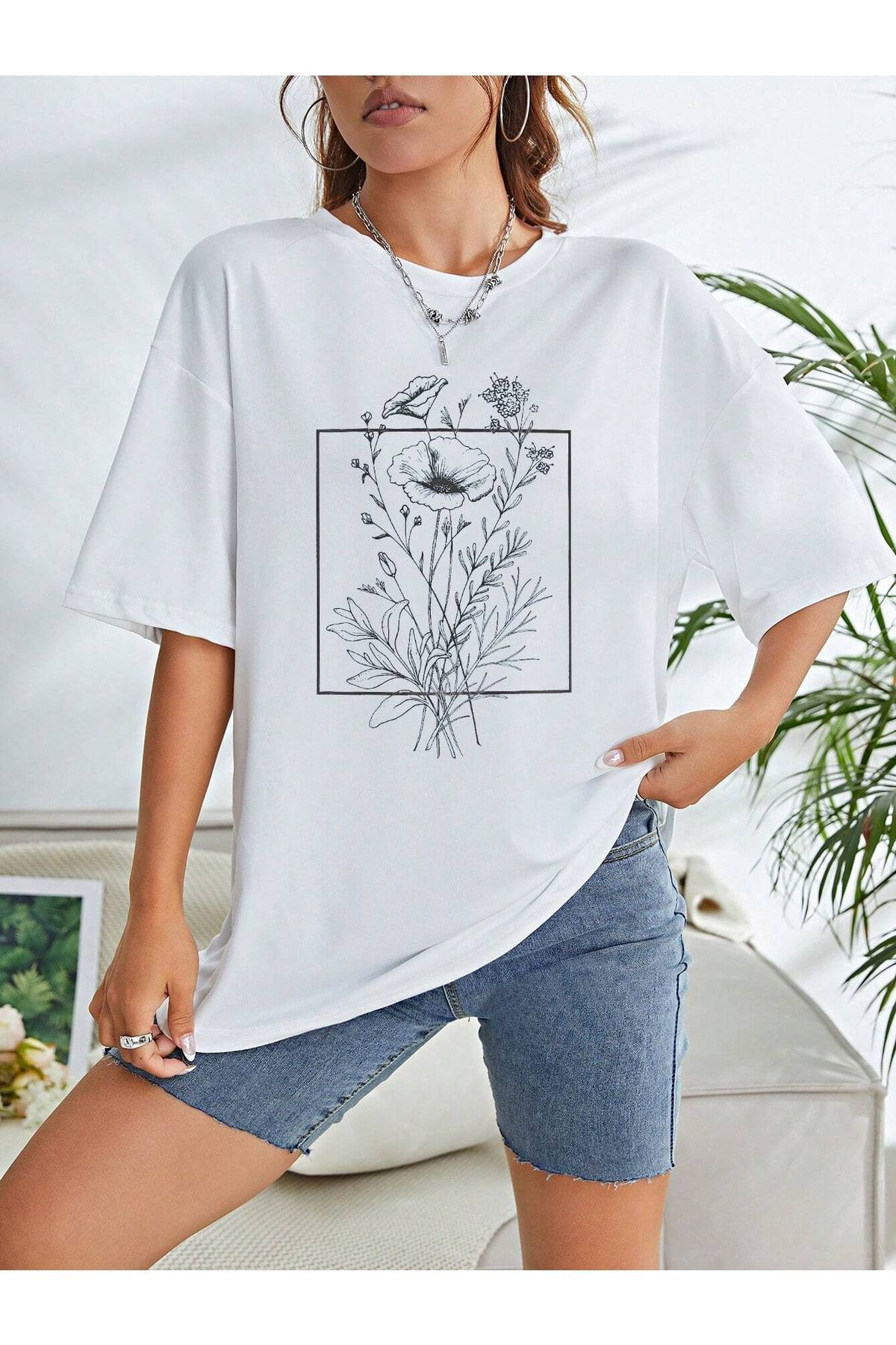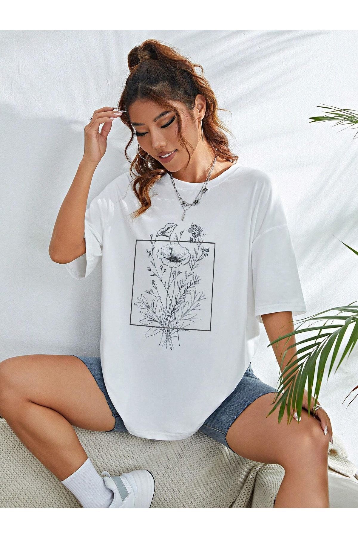 Floral Desen T-shirt - Beyaz Baskılı Oversize Bisiklet Yaka Kısa Kol Tişört