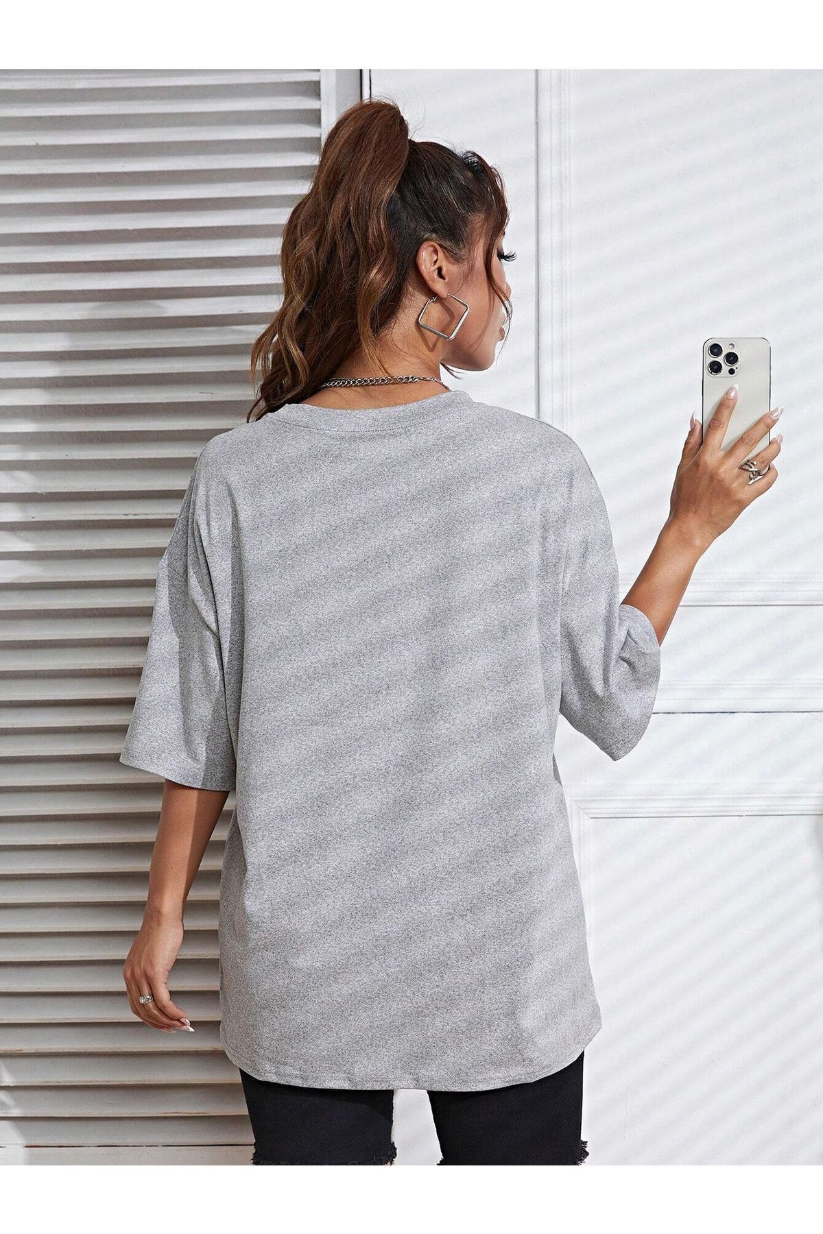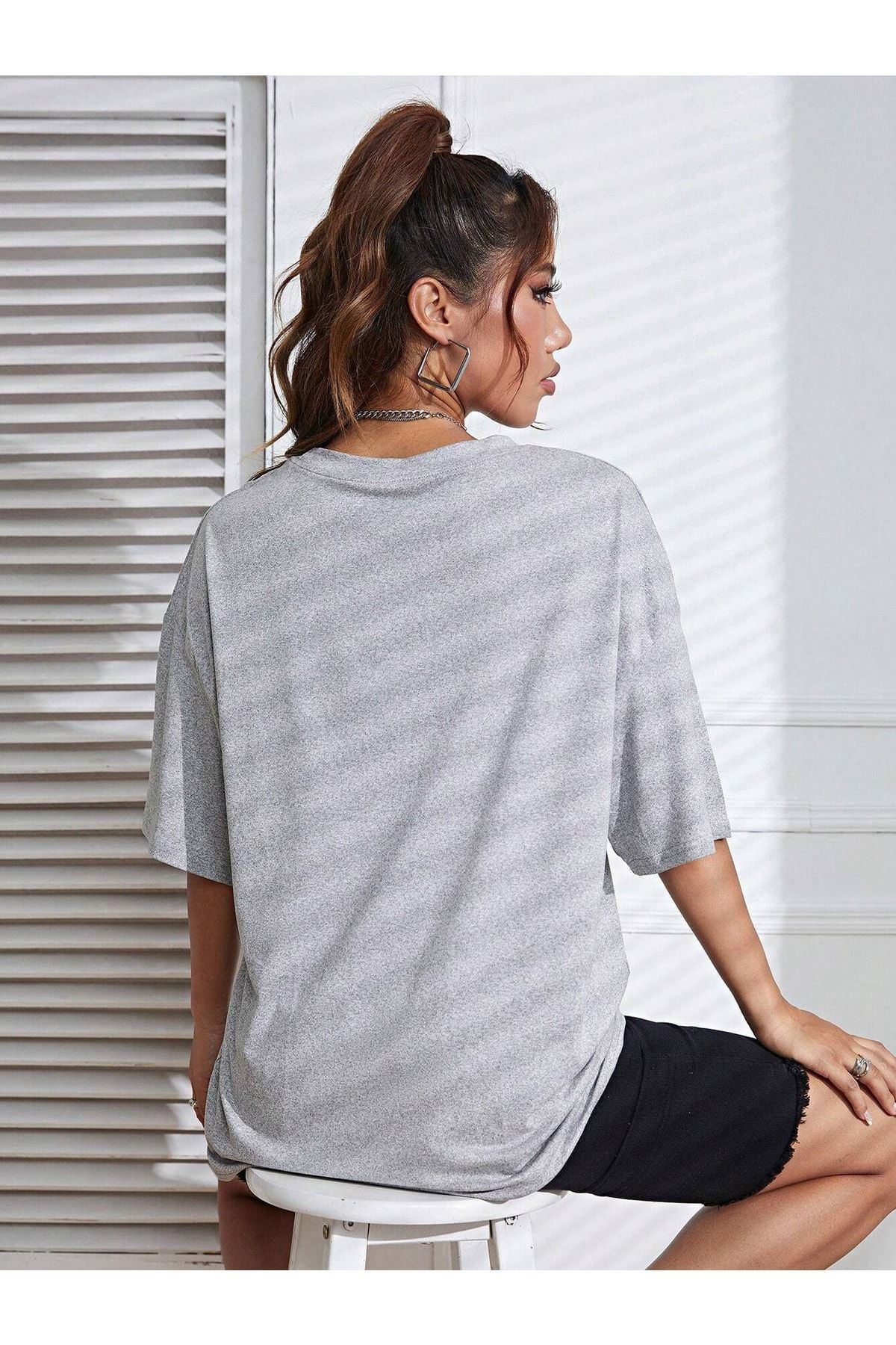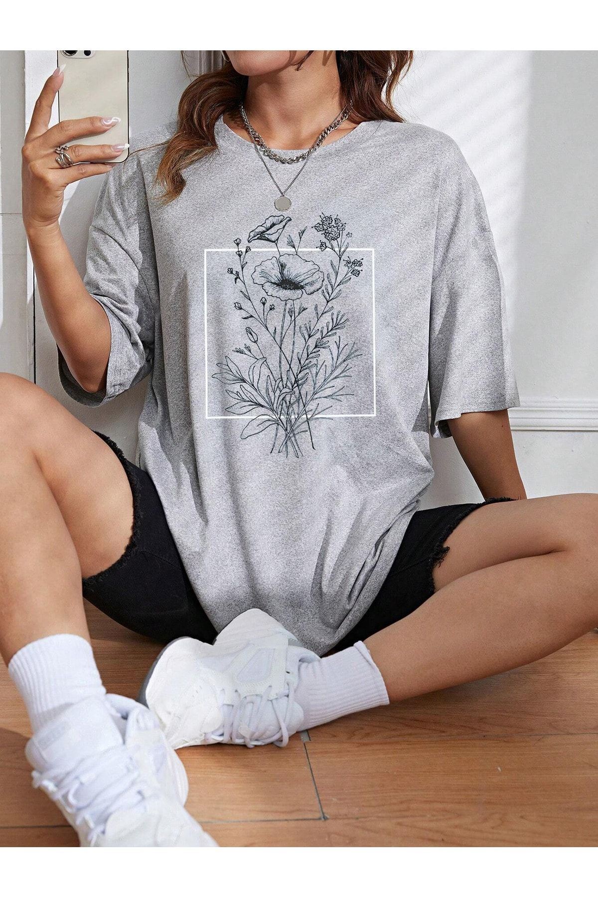 Floral Desen T-shirt - Gri Baskılı Oversize Bisiklet Yaka Kısa Kol Tişört