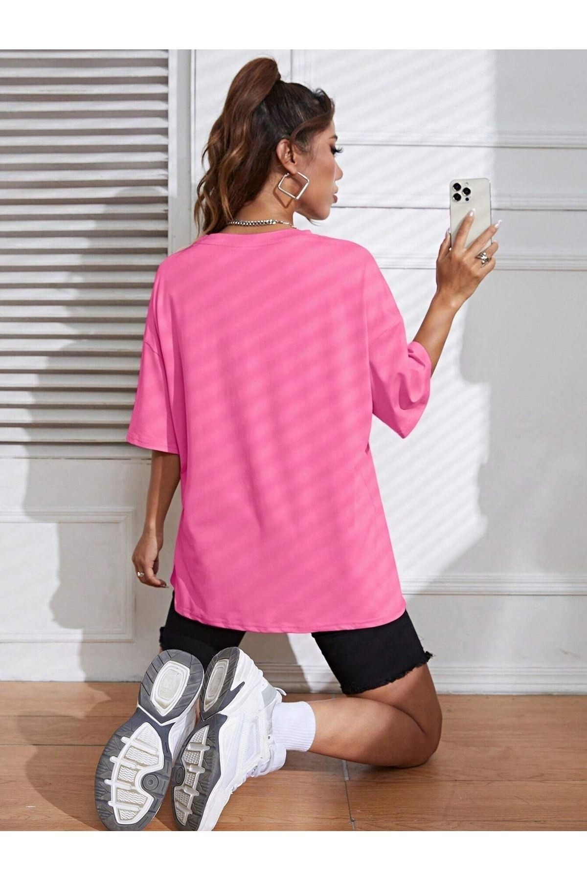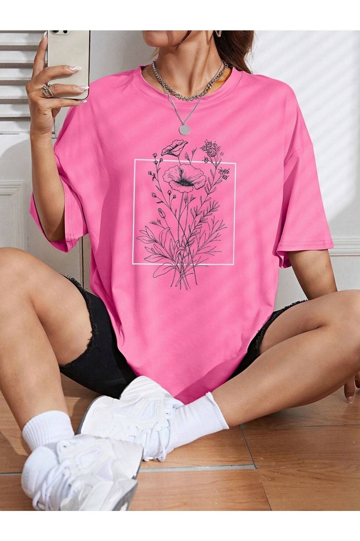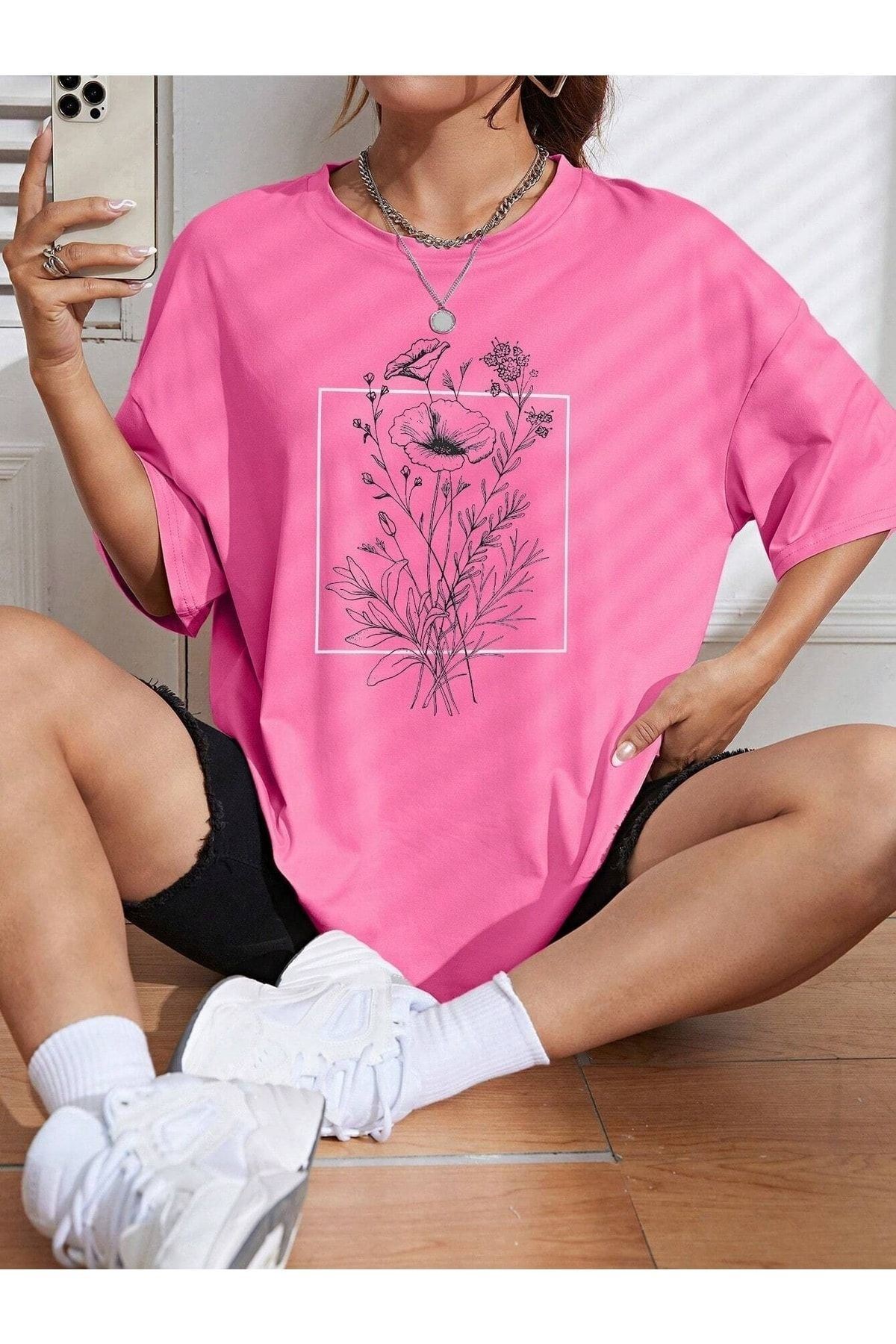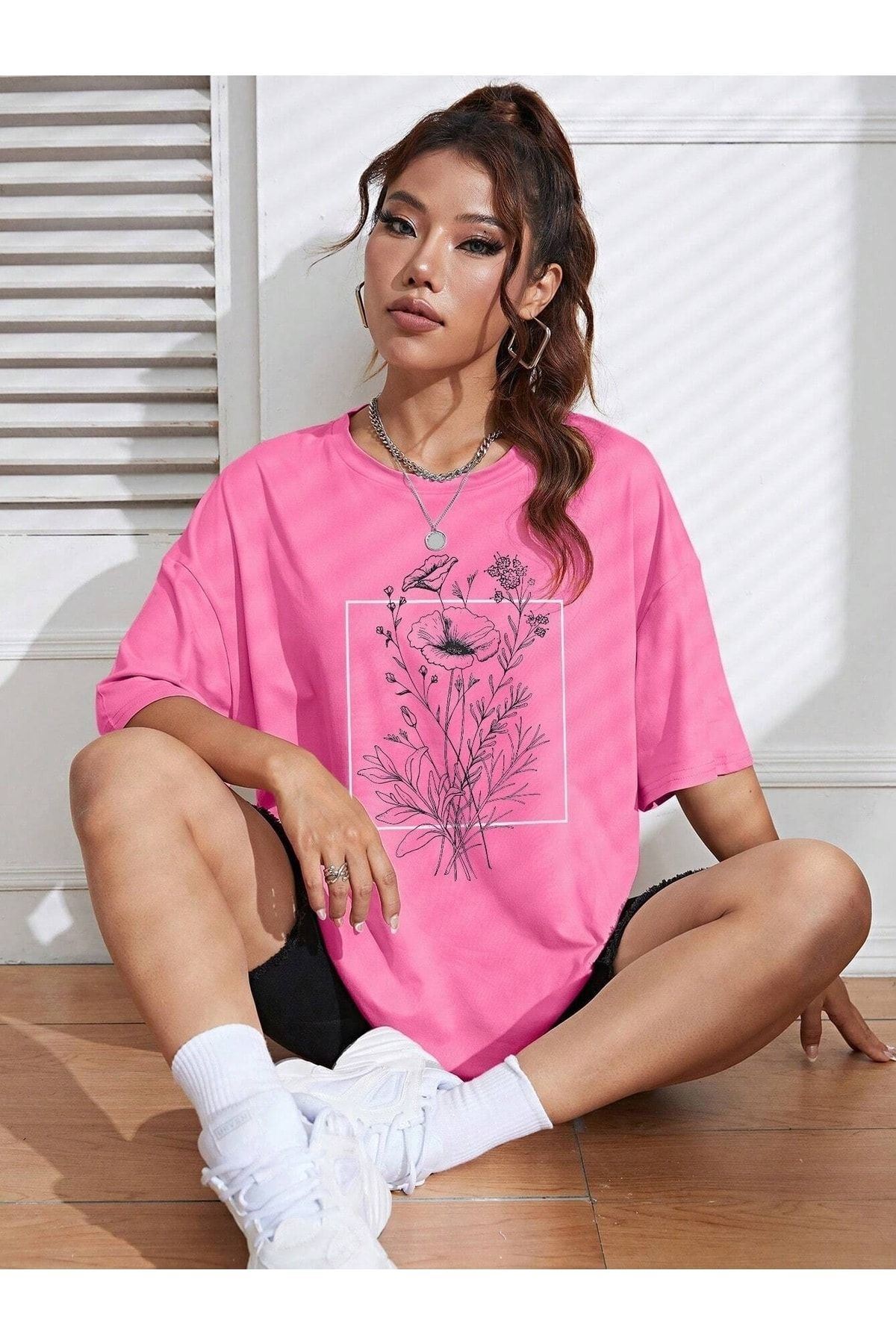 Floral Desen T-shirt - Pembe Baskılı Oversize Bisiklet Yaka Kısa Kol Tişört