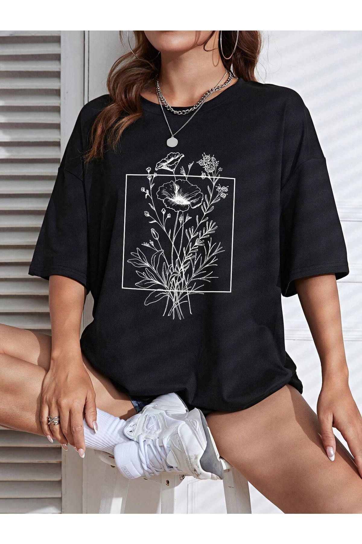 Floral Desen T-shirt - Siyah Baskılı Oversize Bisiklet Yaka Kısa Kol Tişört