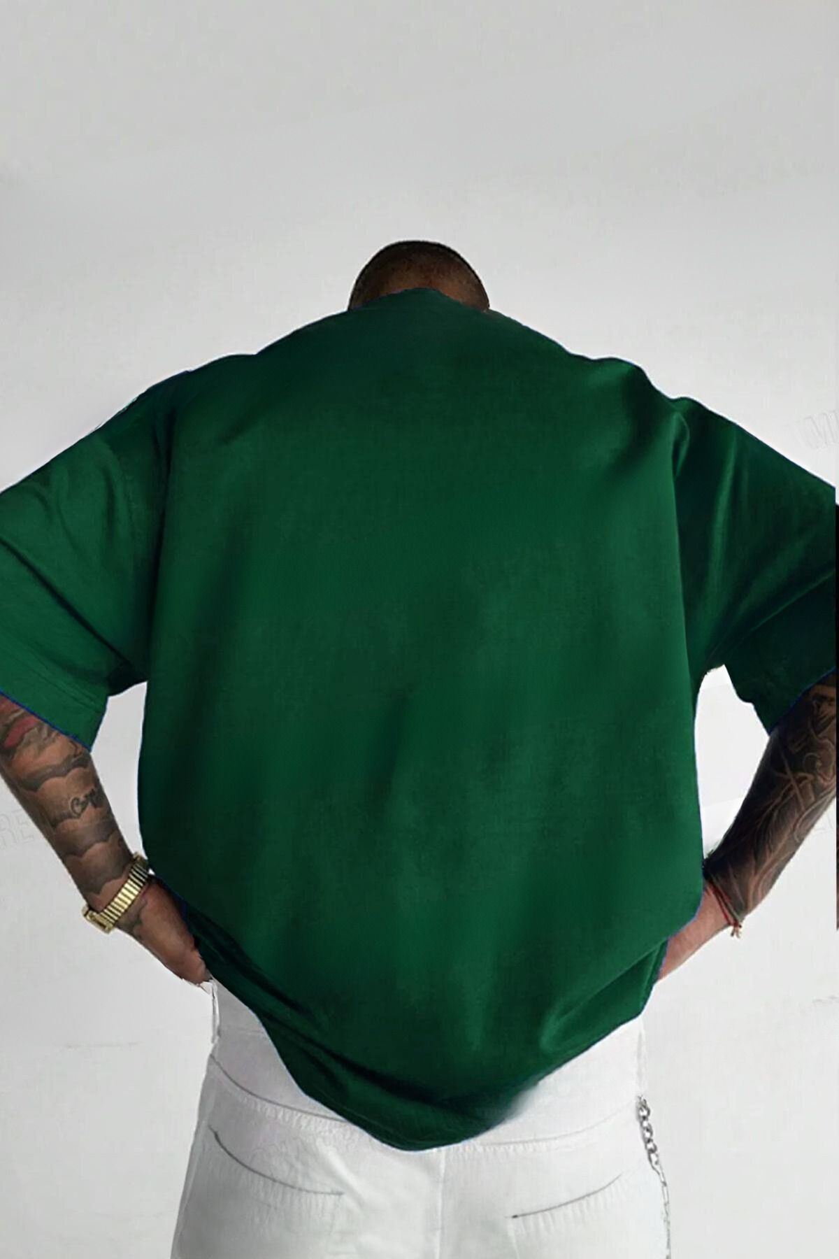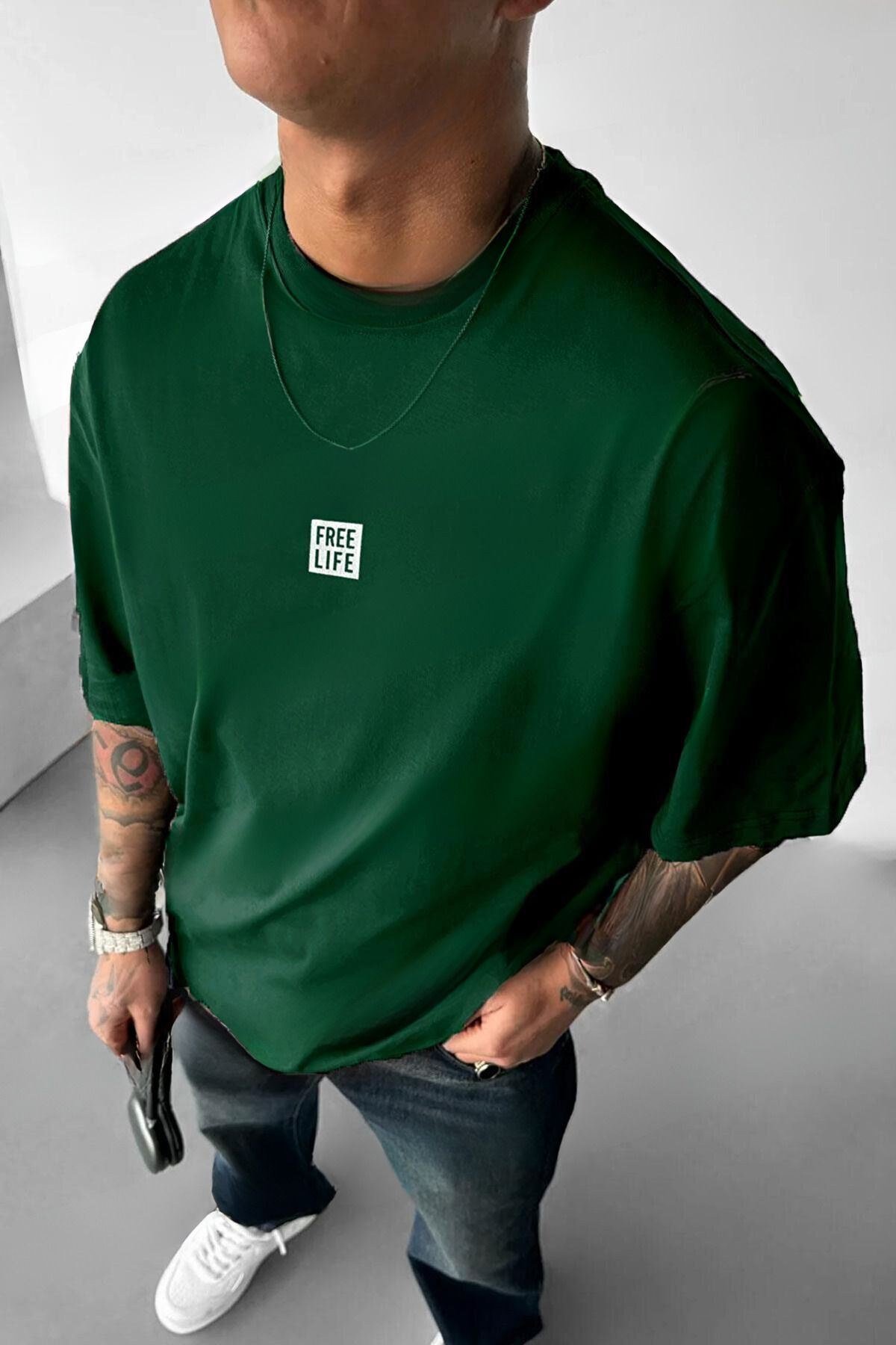 Free Life Oversize Yeşil Baskılı T-shirt - Bisiklet Yaka Kısa Kol Rahat Kalıp Tişört