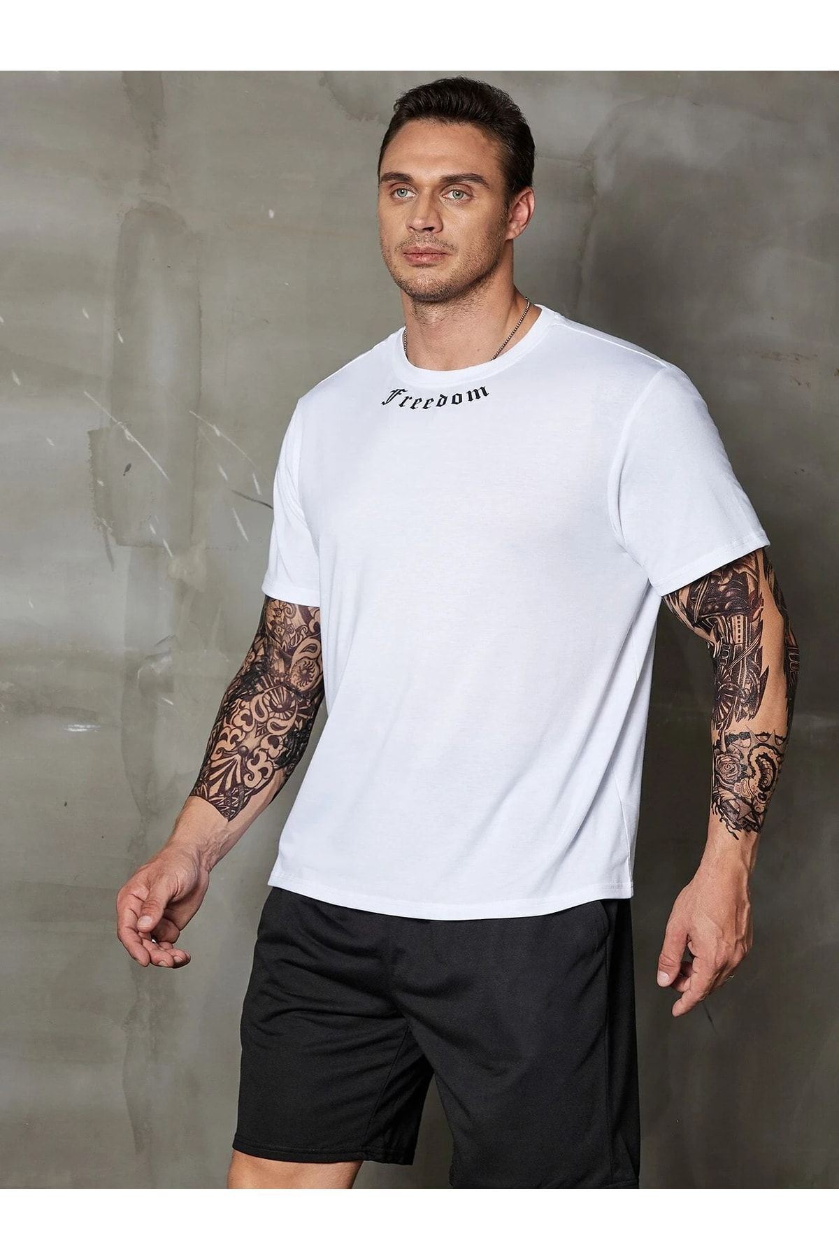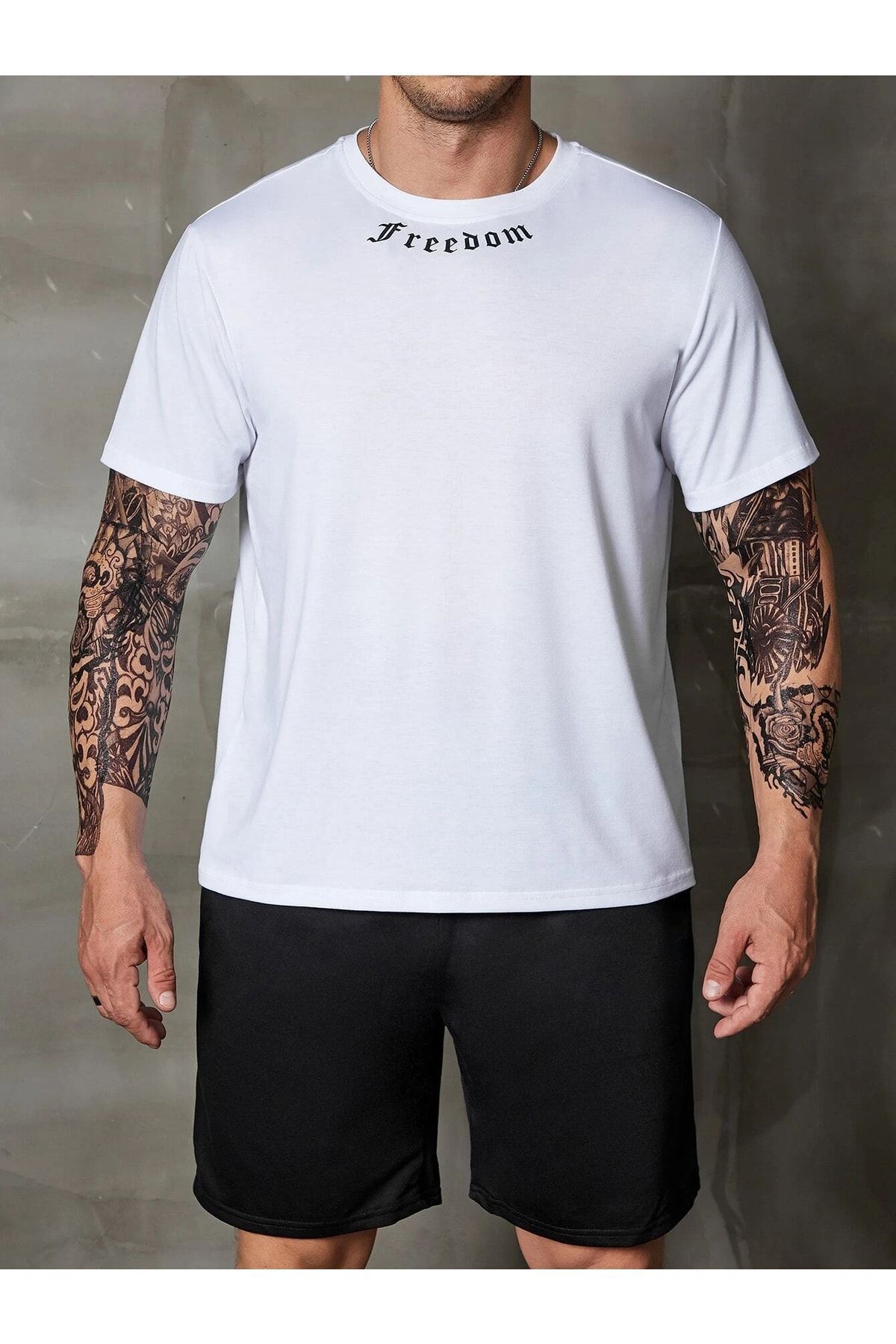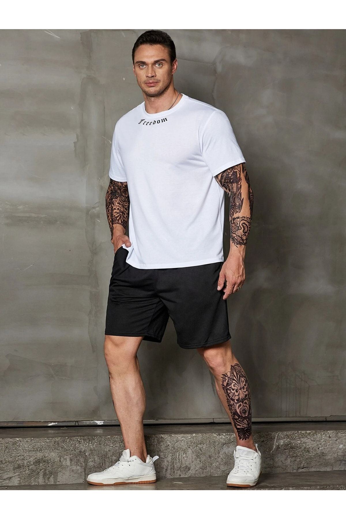 Freedom Yaka T-Shirt Şort - Beyaz Siyah Alt Üst Takım Şort Tişört Kombin Baskılı Bisiklet Yaka