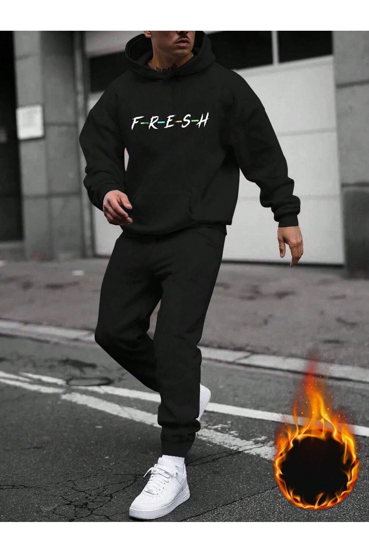 Fresh Eşofman Takımı Sweatshirt Jogger - Siyah Baskılı Şardonlu Kapüşonlu