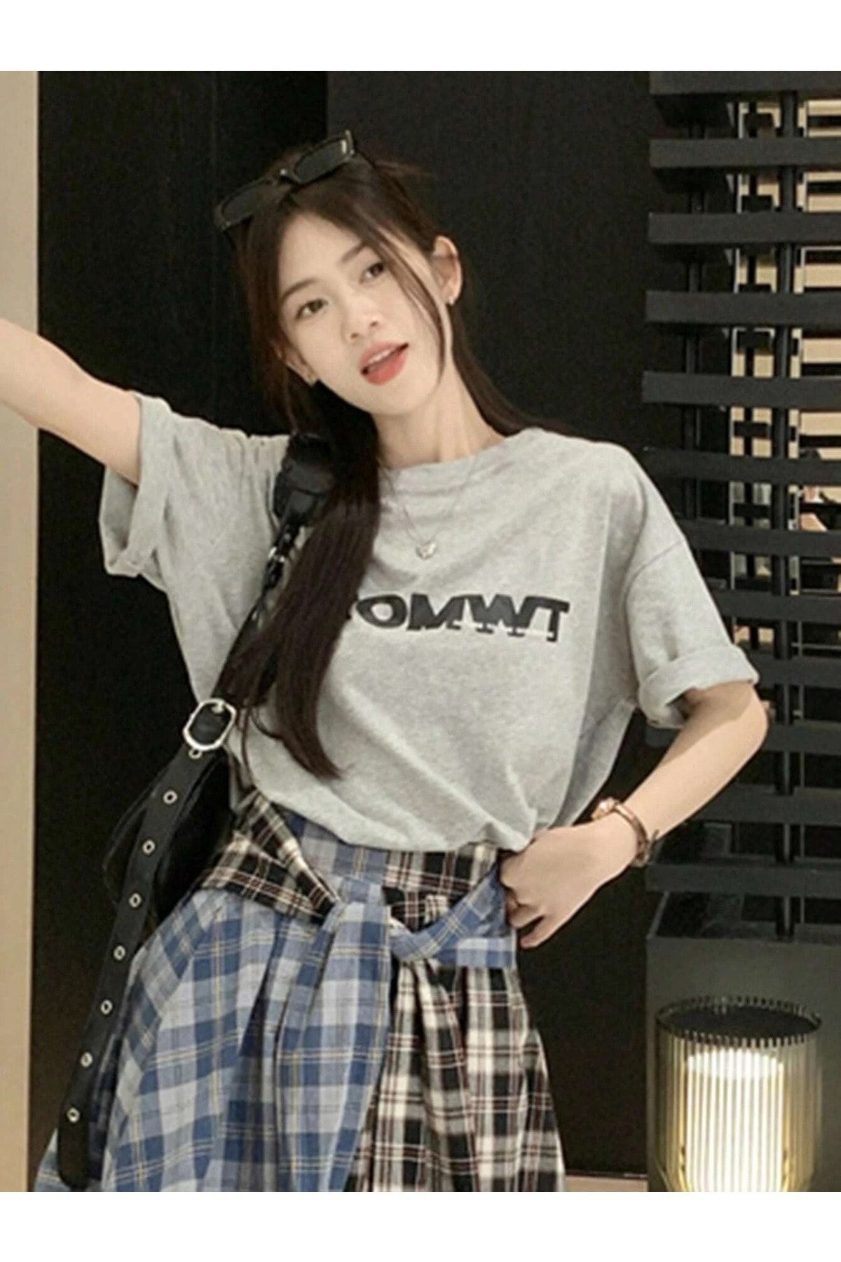 Fromwt T-Shirt - Gri Baskılı Oversize Bisiklet Yaka Kısa Kol