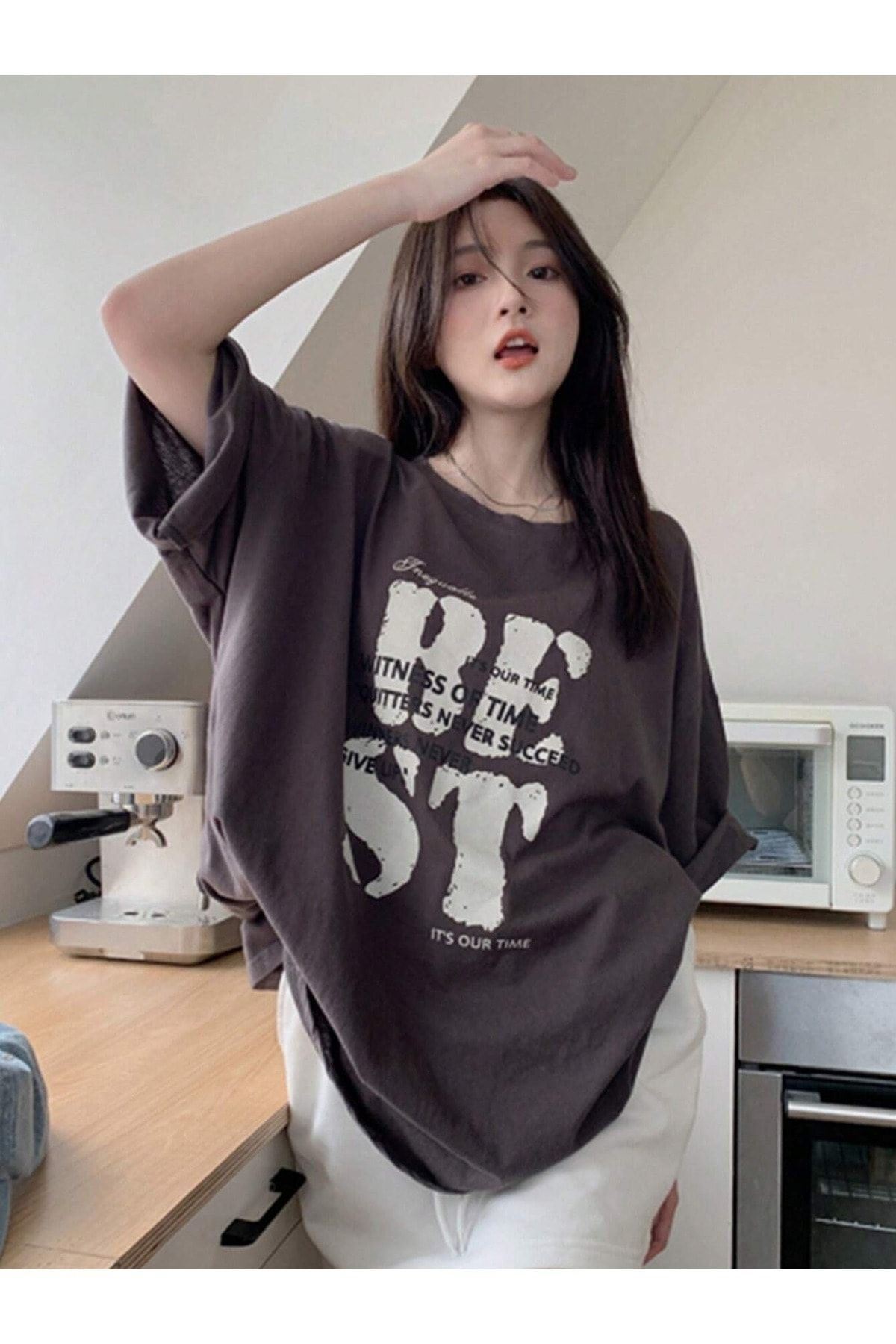 Füme Best Baskılı T-shirt - Füme Baskılı Oversize Bisiklet Yaka Kısa Kol
