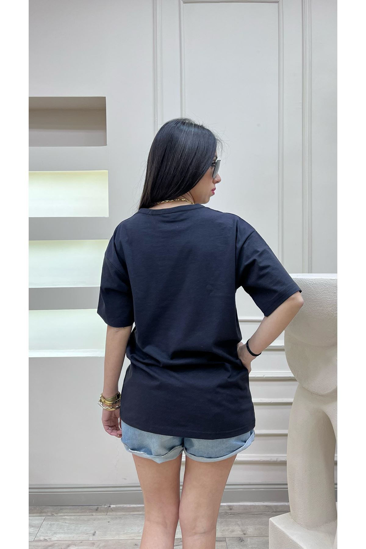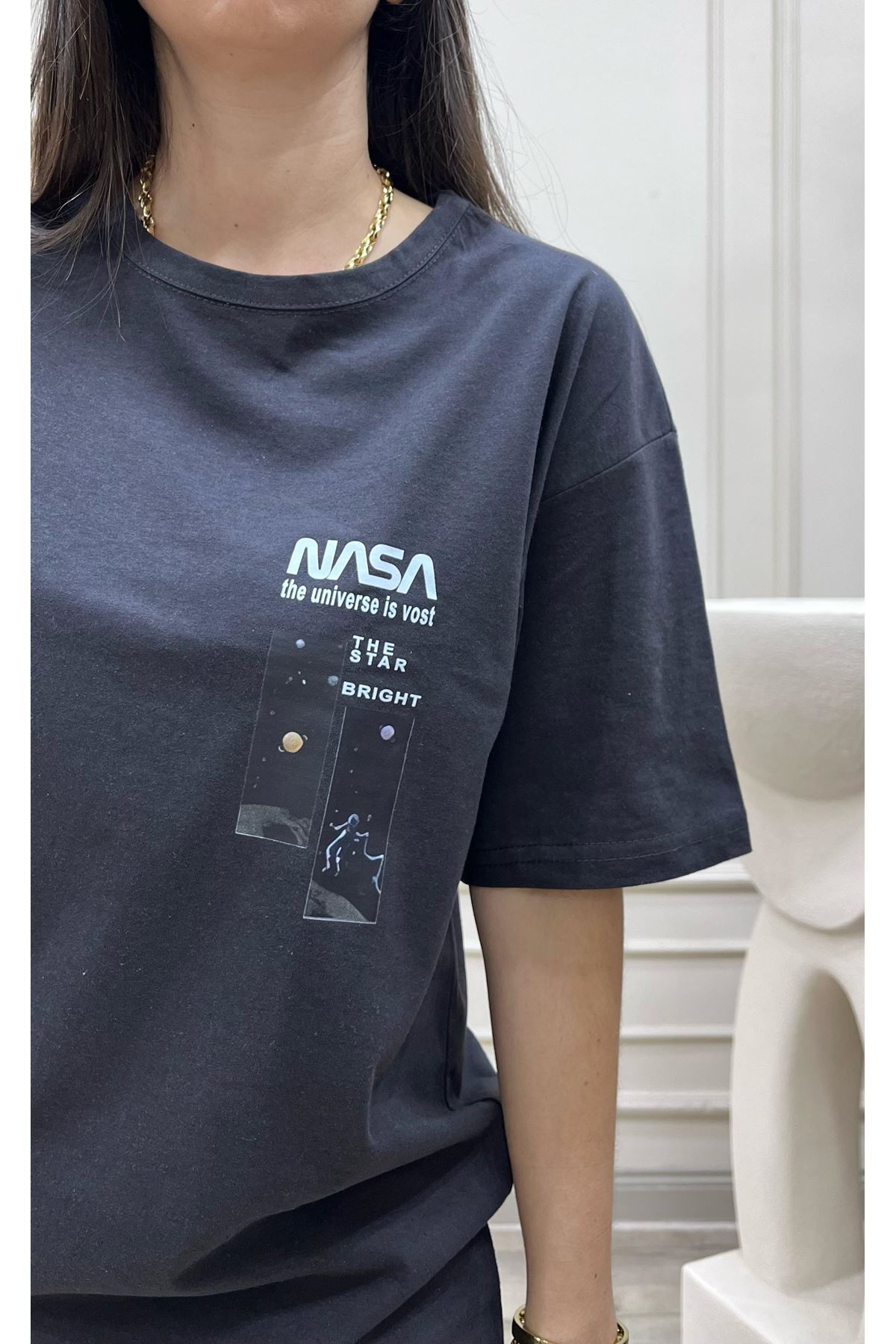 Füme Nasa Baskılı Süprem T-Shirt - Oversize Bisiklet Yaka Kısa Kol Tişört