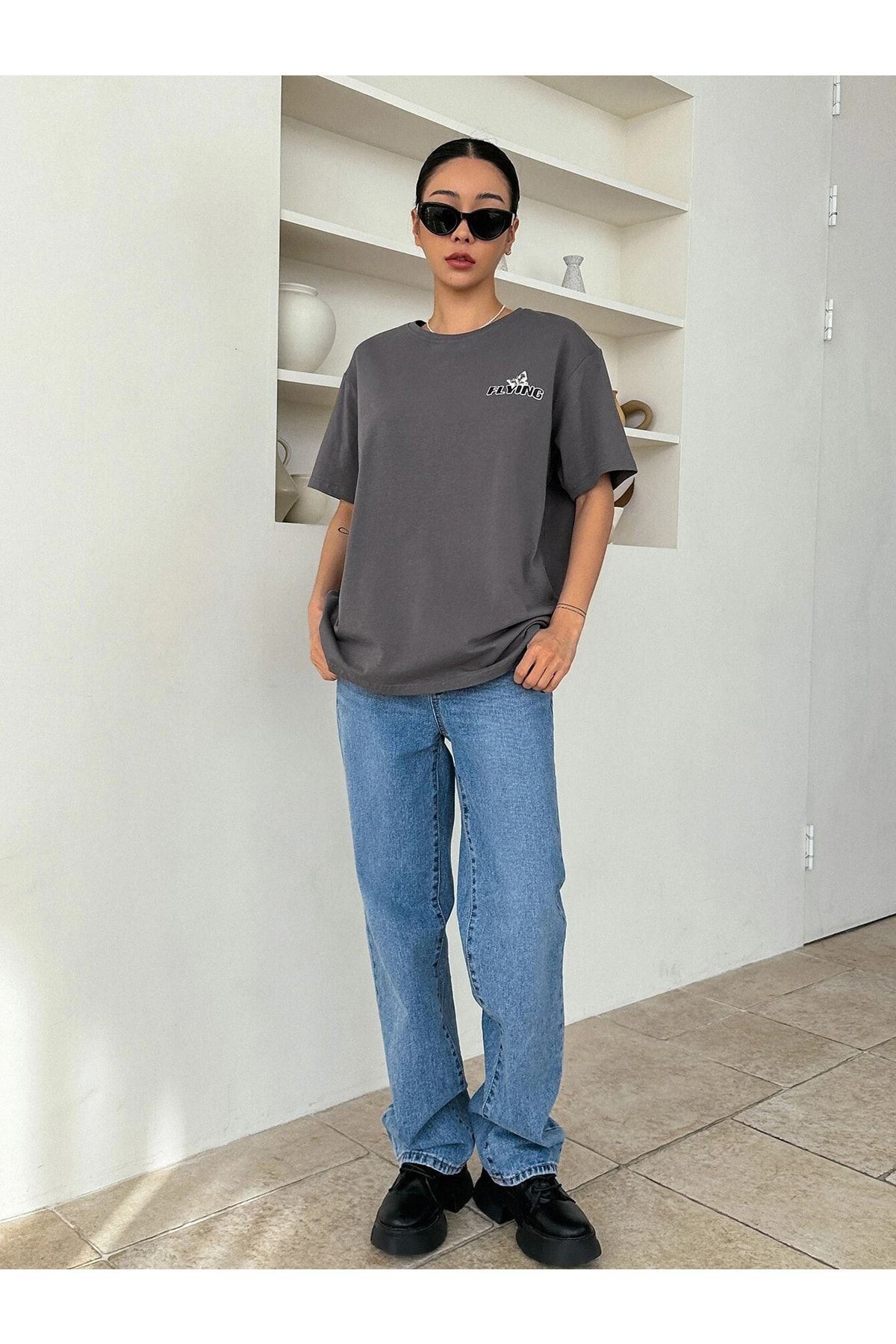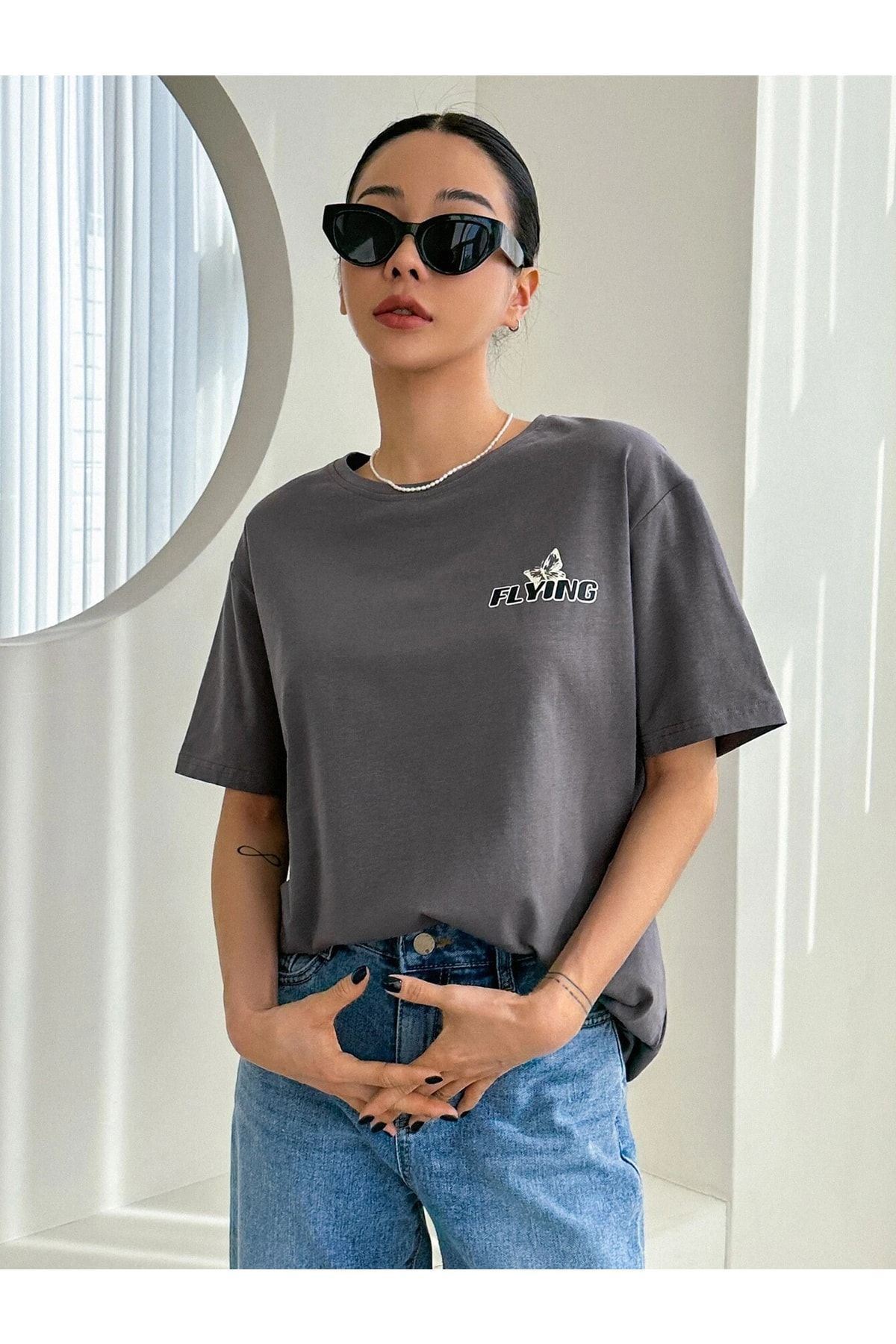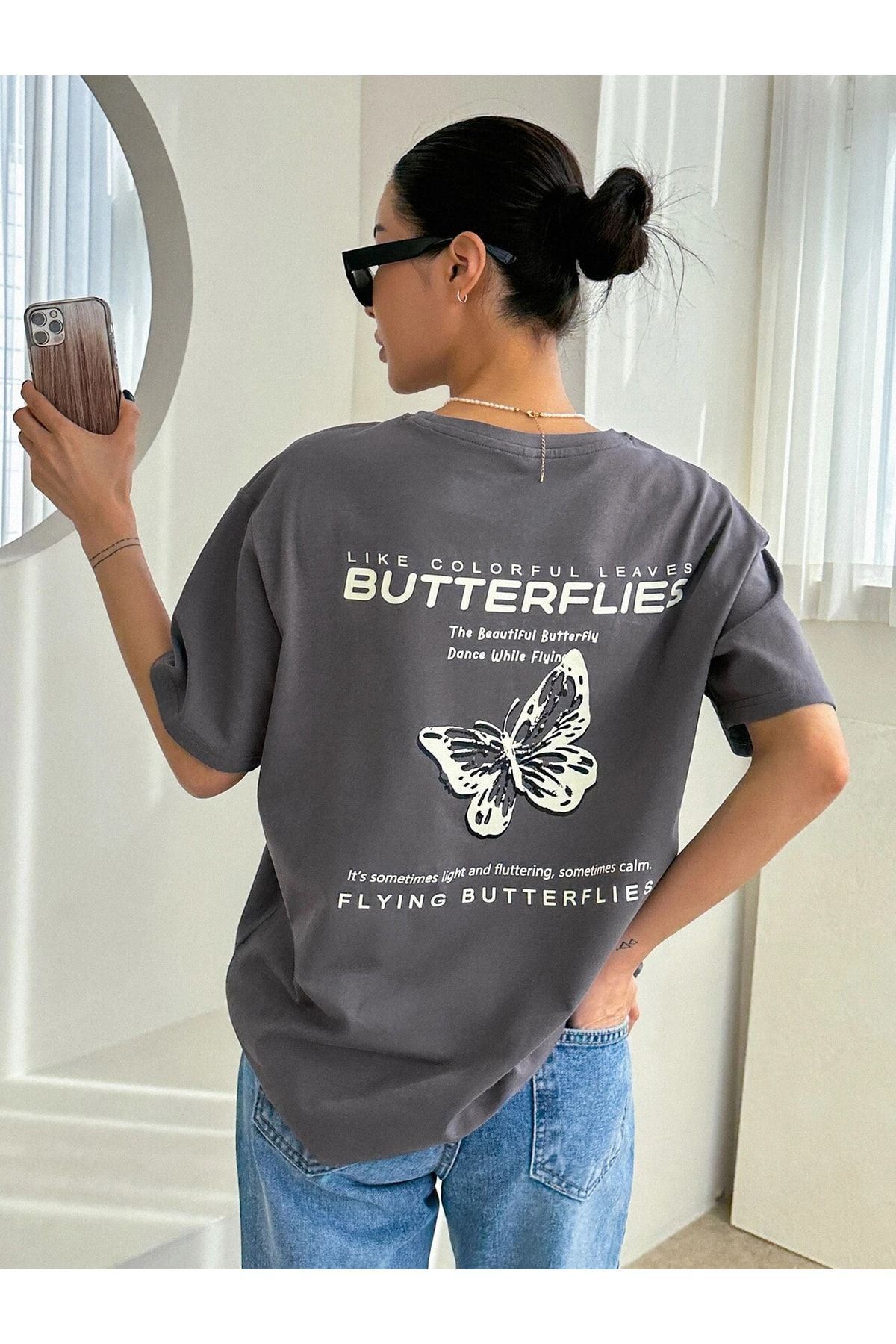 Füme Oversize Butterflies T-shirt - Oversize Baskılı