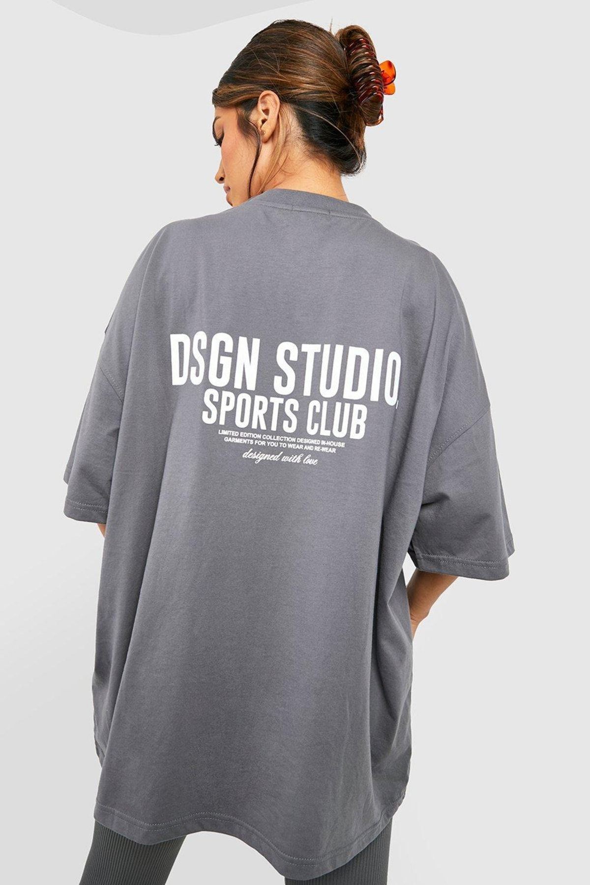 Füme Oversize Dsgn Sports Club T-shirt - Oversize Baskılı