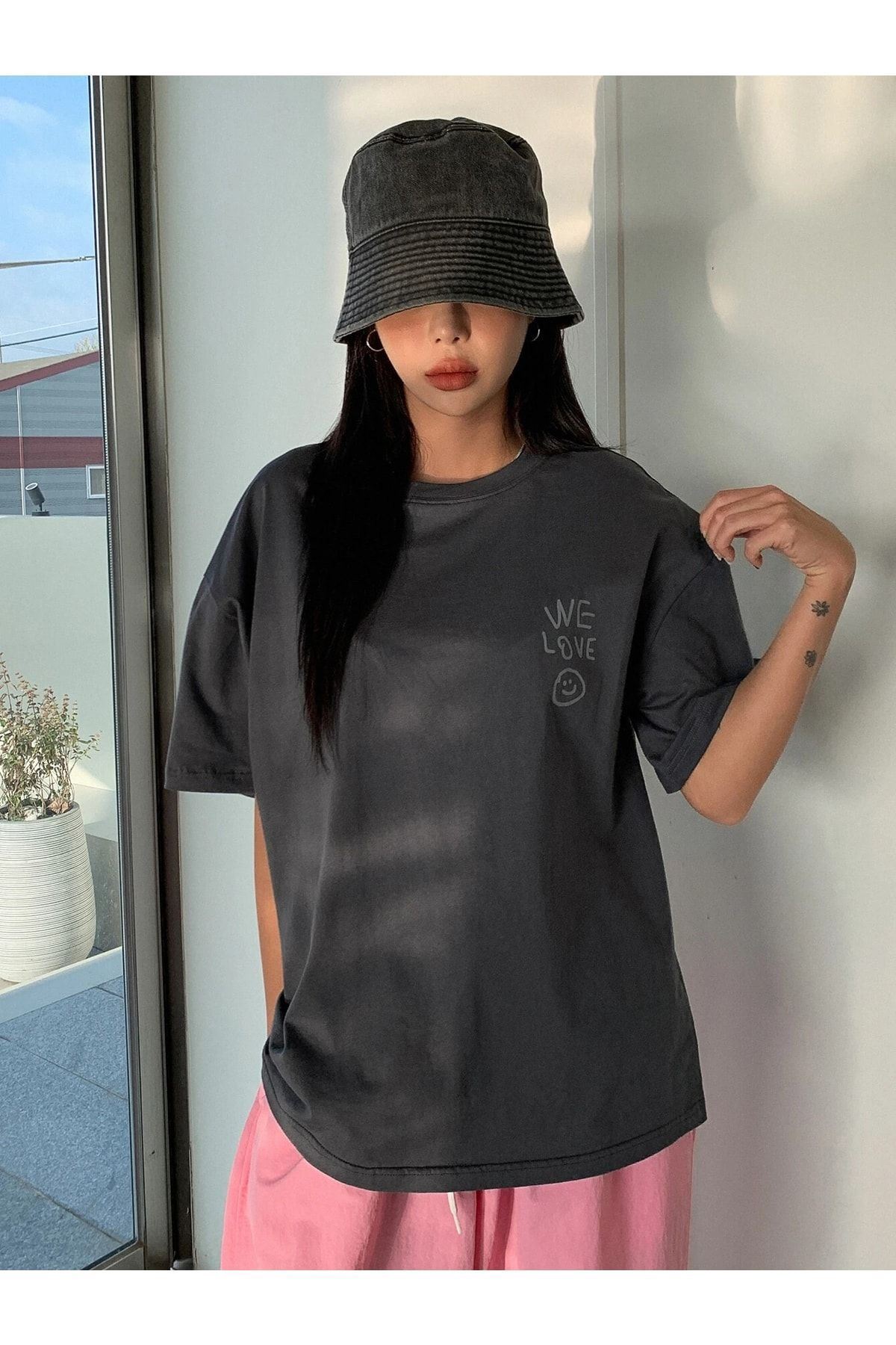 Füme Oversize Love T-shirt - Oversize Baskılı
