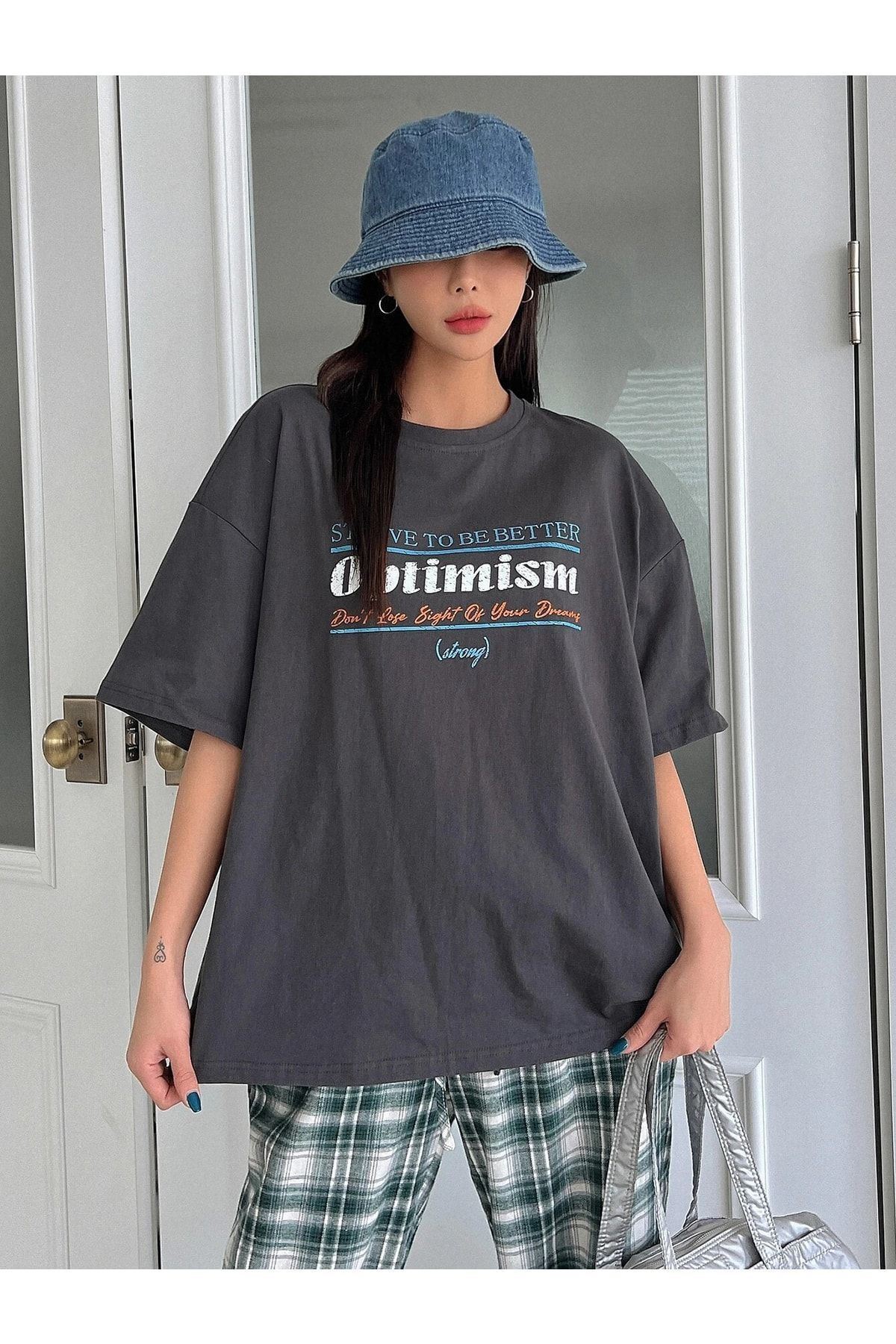 Füme Oversize Optimism T-shirt - Oversize Baskılı