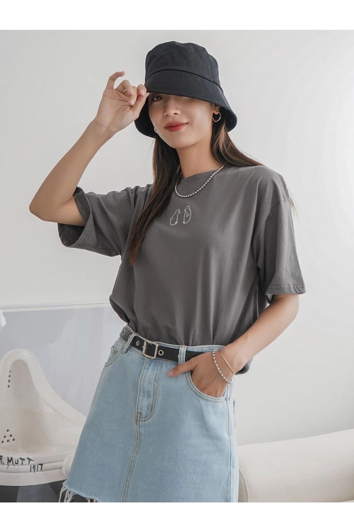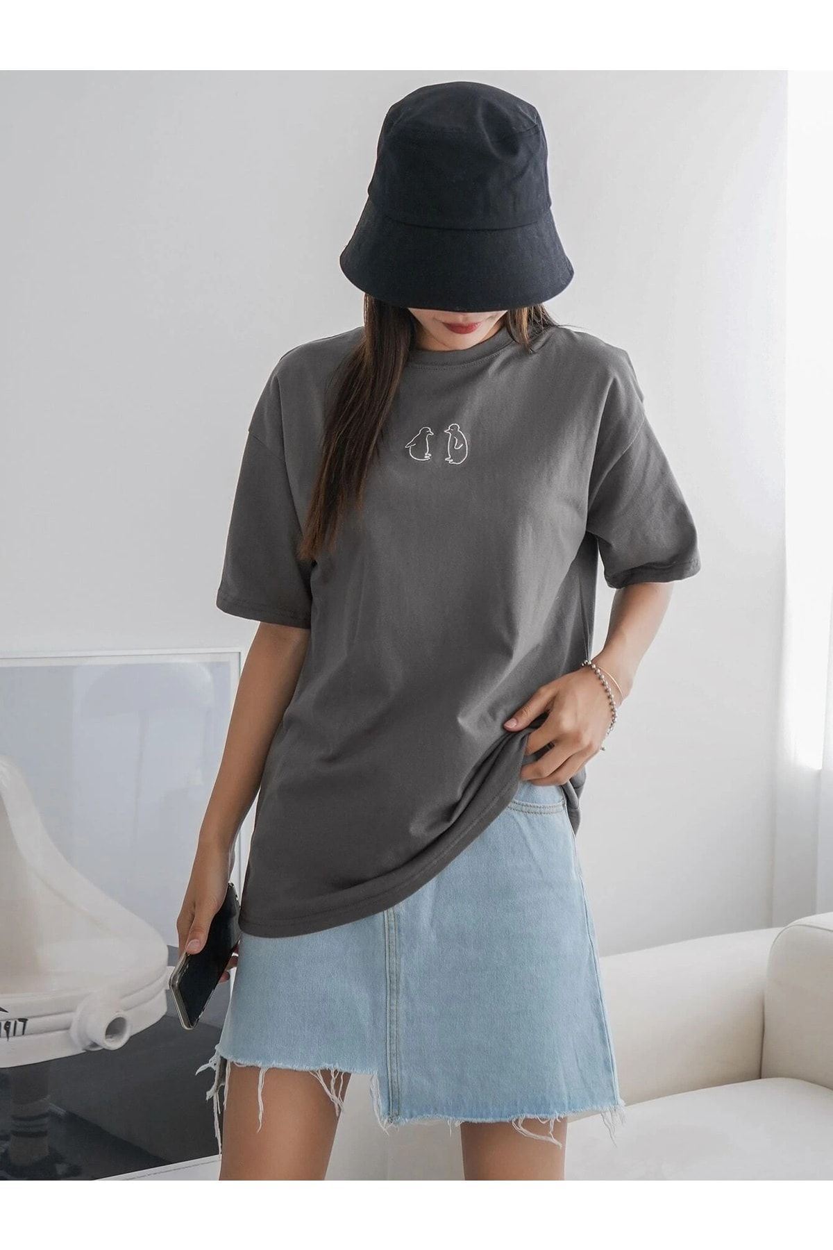 Füme Oversize Penguen T-shirt - Oversize Baskılı