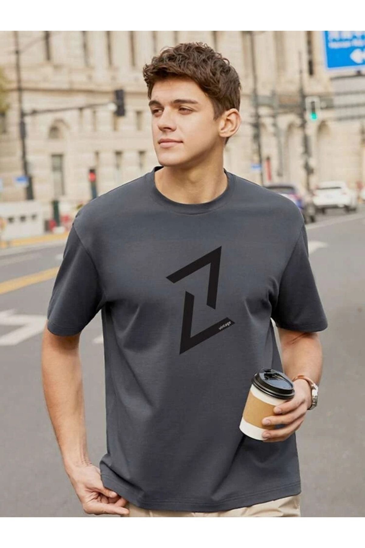 Füme Oversize Şekil Baskılı T-shirt - Oversize Baskılı