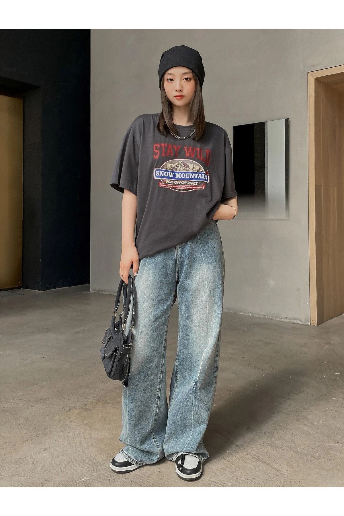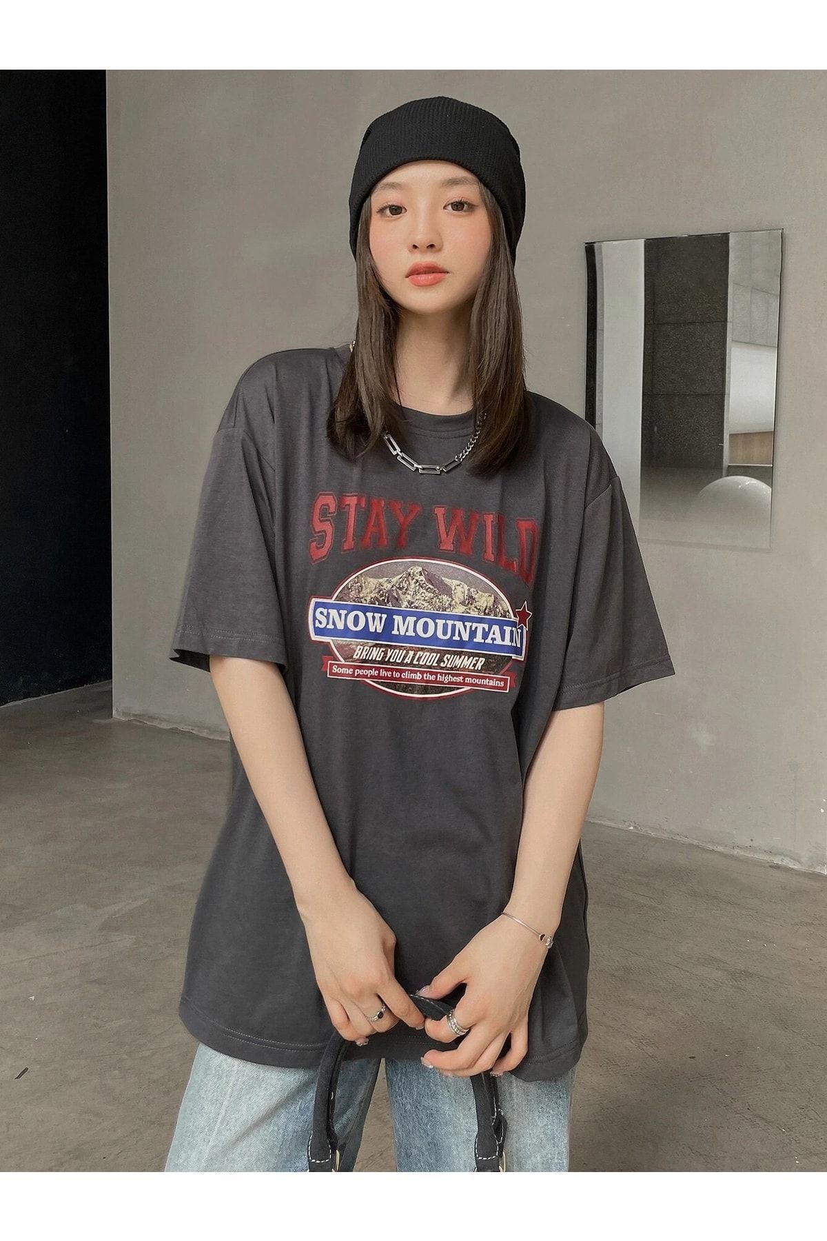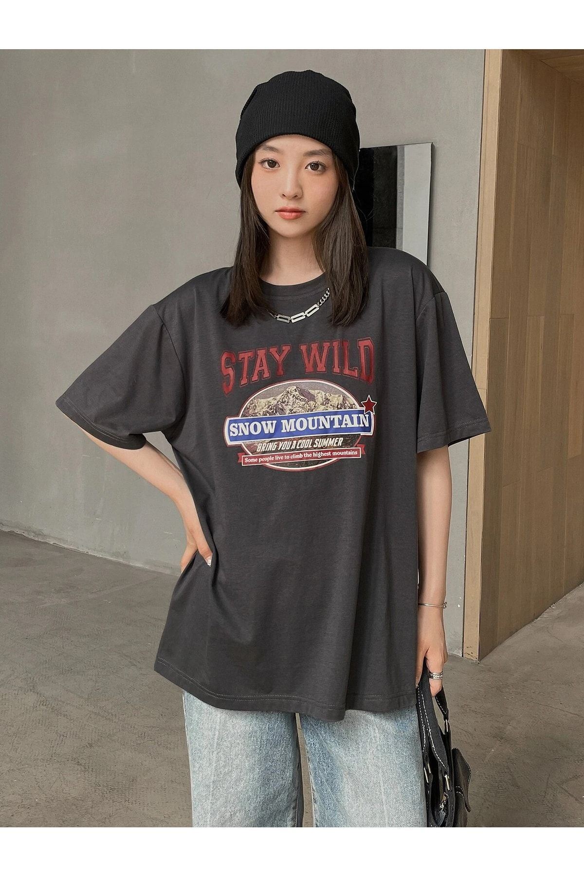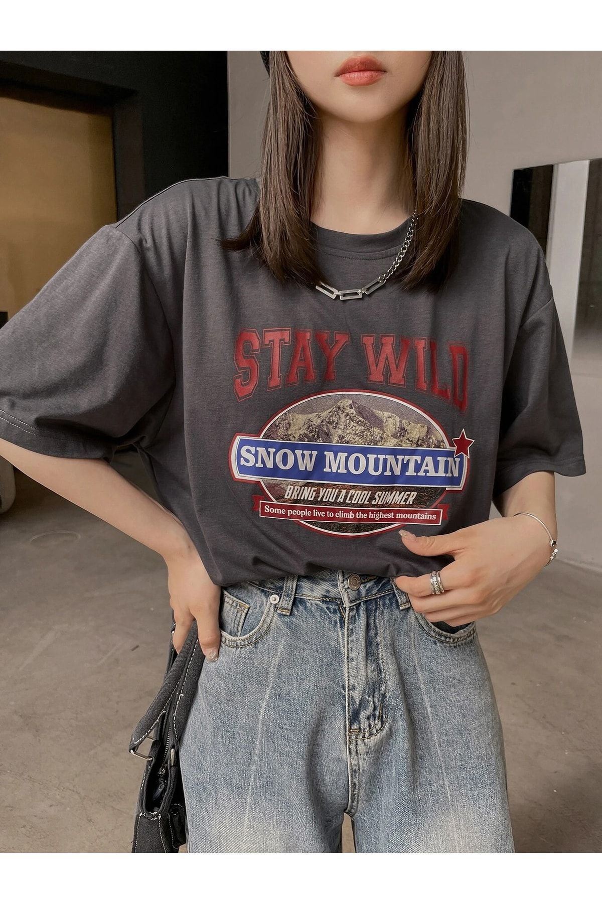 Füme Oversize Stay Wild T-shirt - Oversize Baskılı