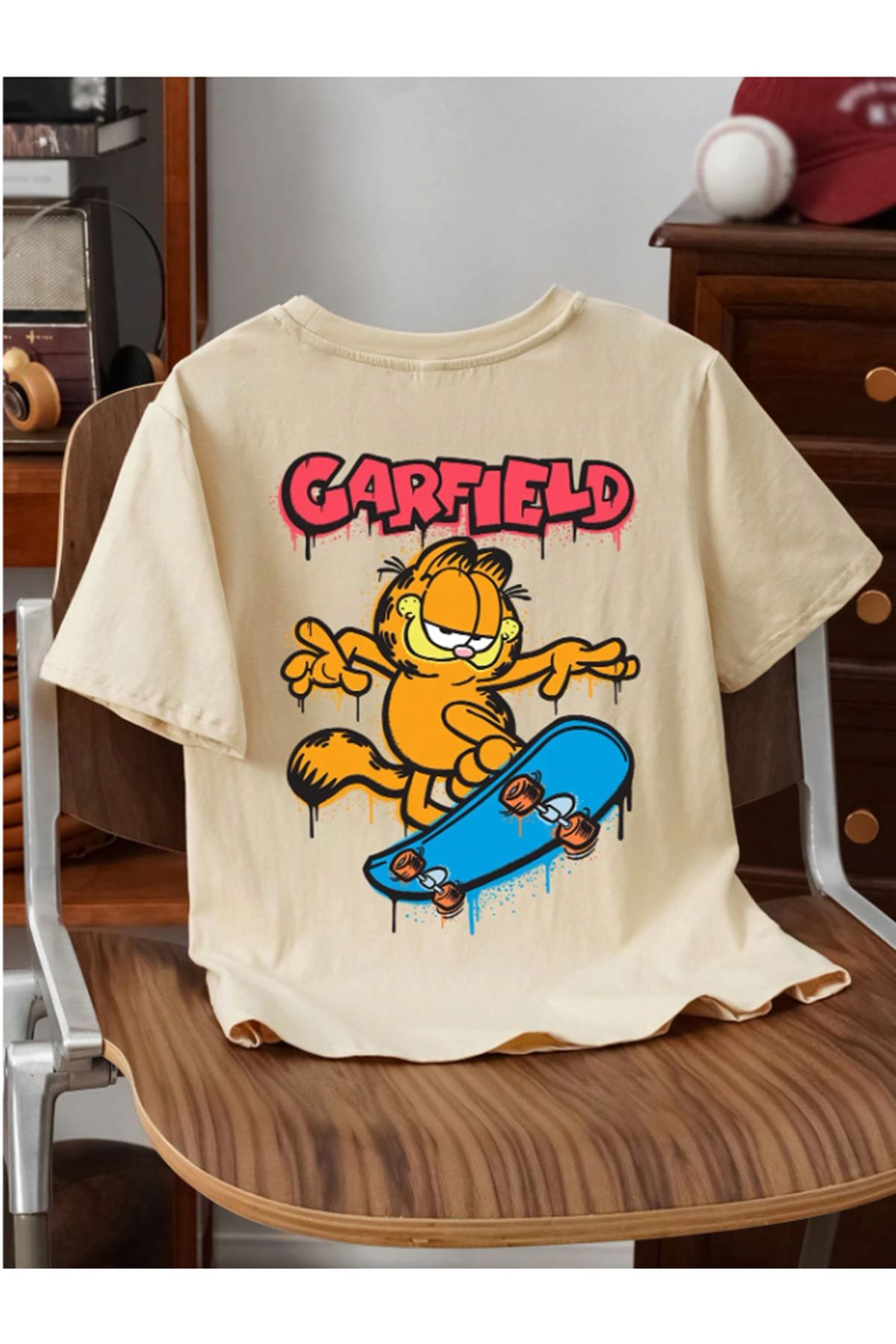 Garfield Ön Arka Baskılı Çocuk Bej T-Shirt- Kız Erkek Çocuk Yazlık Bisiklet Yaka Tişört
