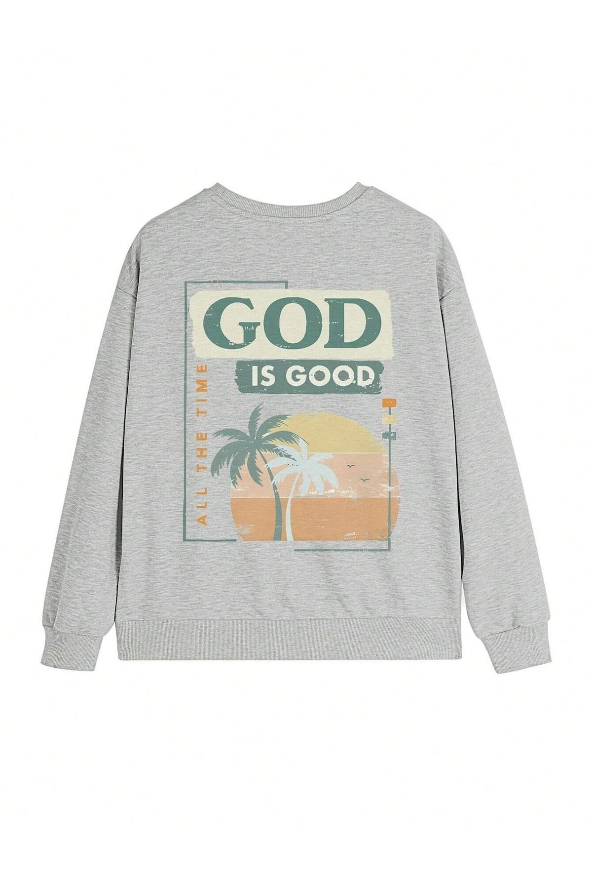 God Is Good Kışlık Kalın Sweatshirt - Gri Baskılı Oversize Kalın Kışlık Bisiklet Yaka