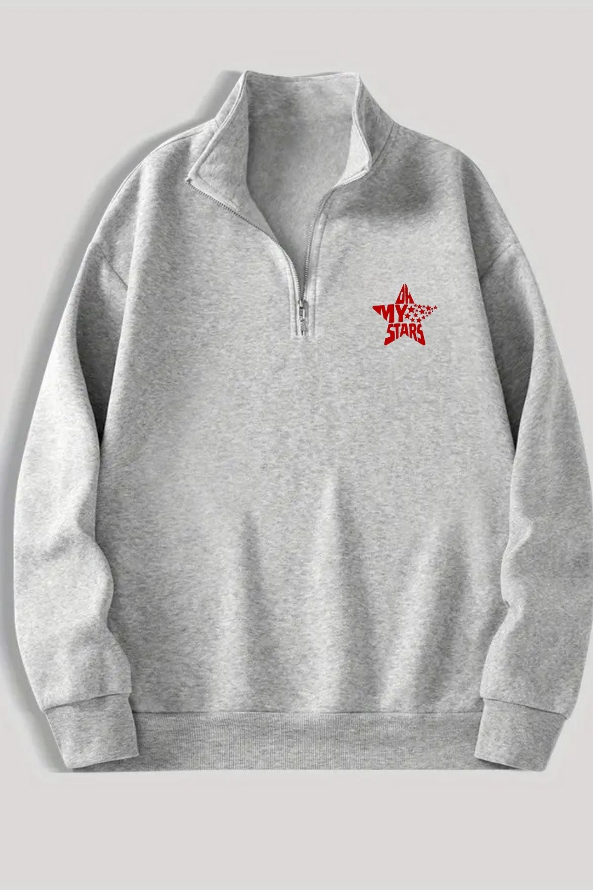 Gri Fermuarlı Dikyaka Sweatshirt- YILDIZ - Kışık Şardonlu Kumaş