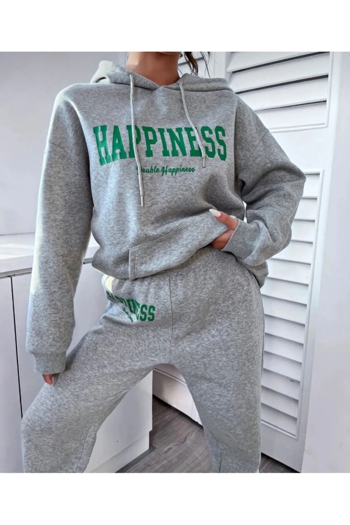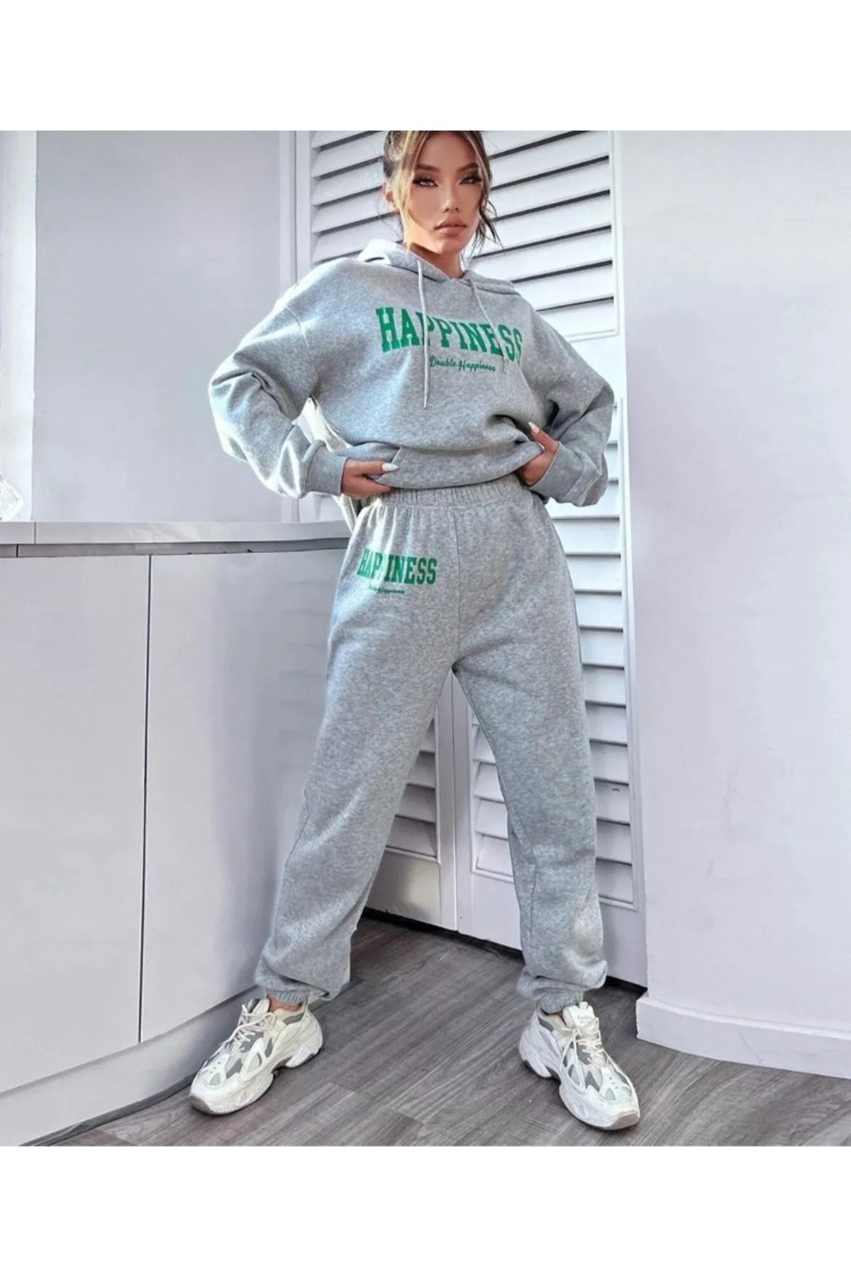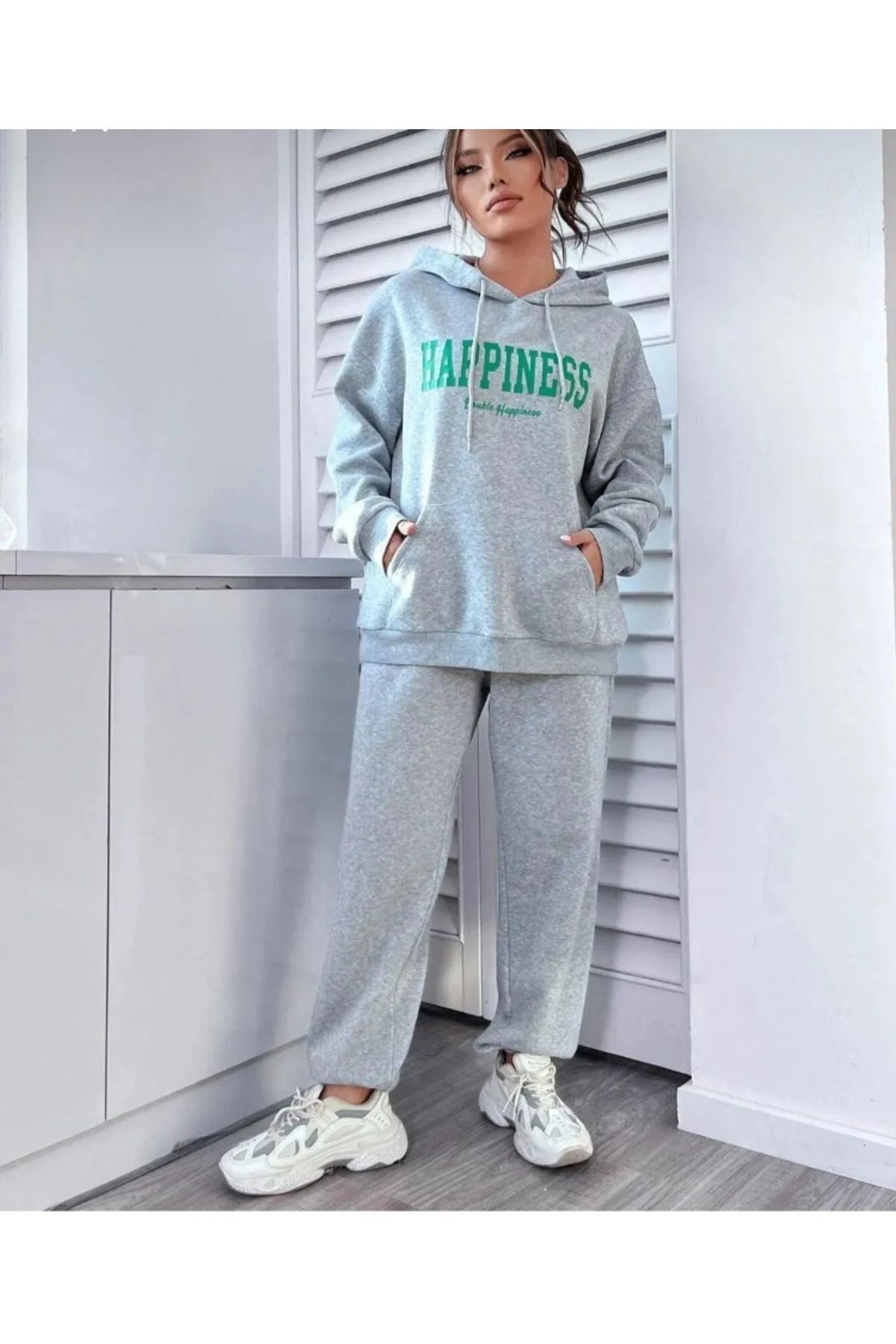 Rahat ve özgür hareket imkanı sunan oversize kalıba sahip sweatshirt ve eşofman takımı, günlük kullanım için idealdir; Lastikli paça tasarımı sayesinde spor yaparken veya evde rahatça hareket edebilirsiniz; Organik materyaller kullanılarak üretilmiş olup, sürdürülebilir moda anlayışını destekler; Dijital baskı teknolojisi ile uygulanan "Gri Happiness" baskısı, canlı ve uzun ömürlü renkler sunar; %100 pamuk materyali cildinize nefes aldırırken, orta kalınlığıyla mevsim geçişlerinde de konfor sağlar; Uzun kollu ve standart kol tipi ile her türlü aktiviteye uygunluk gösterir; tüm yaş gruplarına hitap eder; Sportswear koleksiyonunun bir parçası olarak tasarlanmış olup, spor salonundan sokak modasına kadar geniş kullanım alanına sahiptir; Kapüşonlu yaka tipi ile hem stil sahibi görünmenizi sağlar hem de soğuk havalarda ekstra koruma sunar; Örme kumaş yapısı sayesinde esneklik kazandırarak vücut hatlarınıza uyum sağlar; Ş;