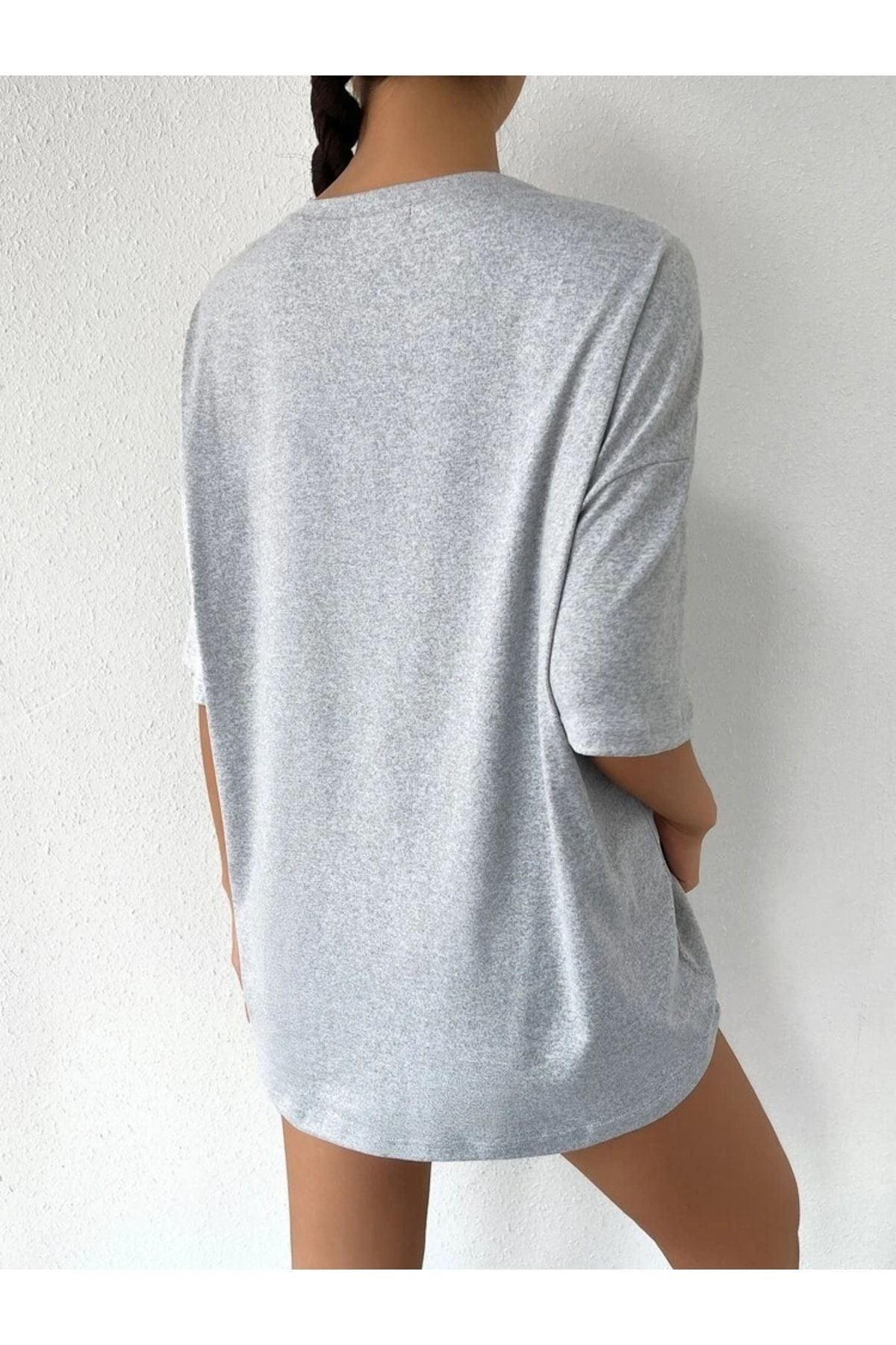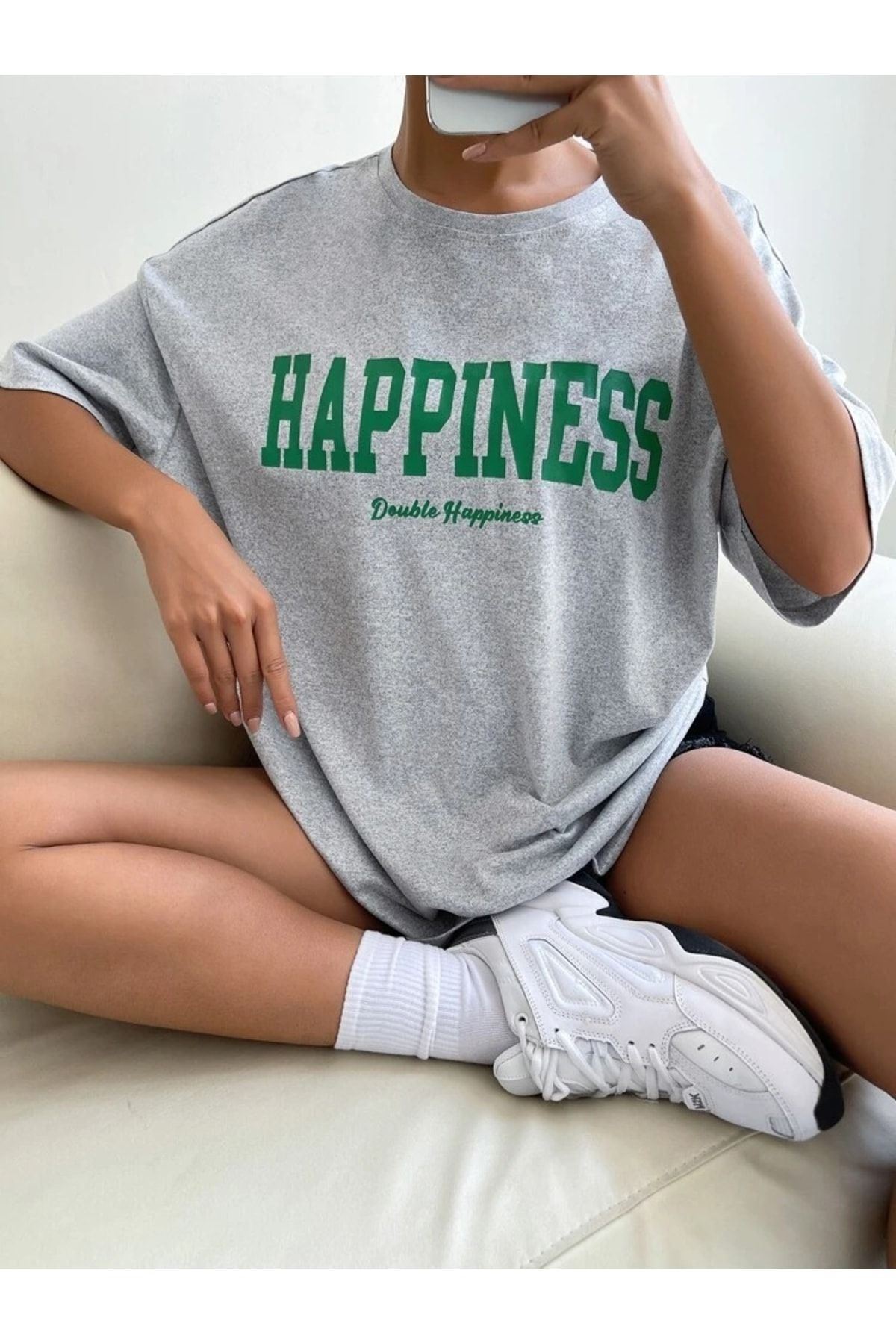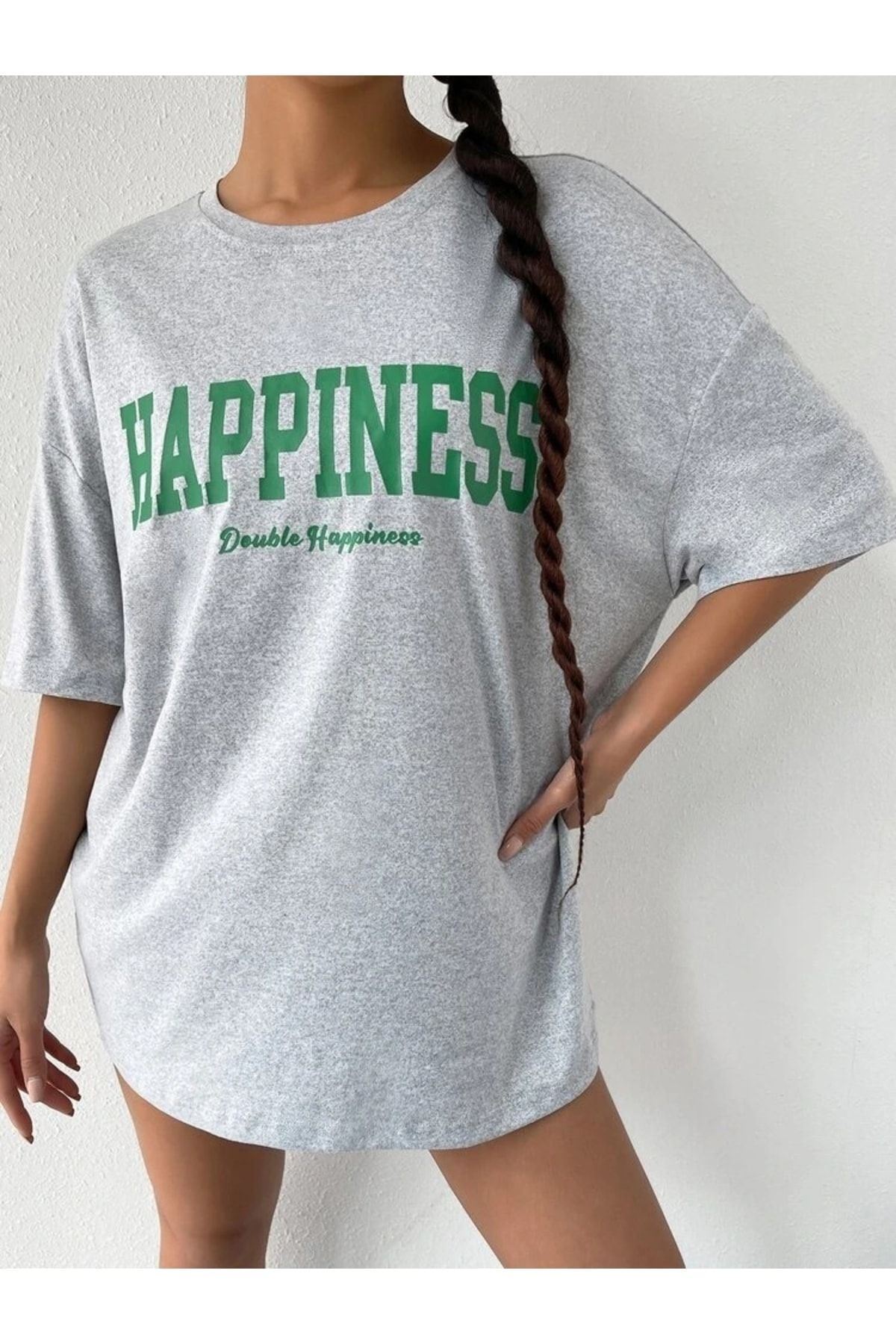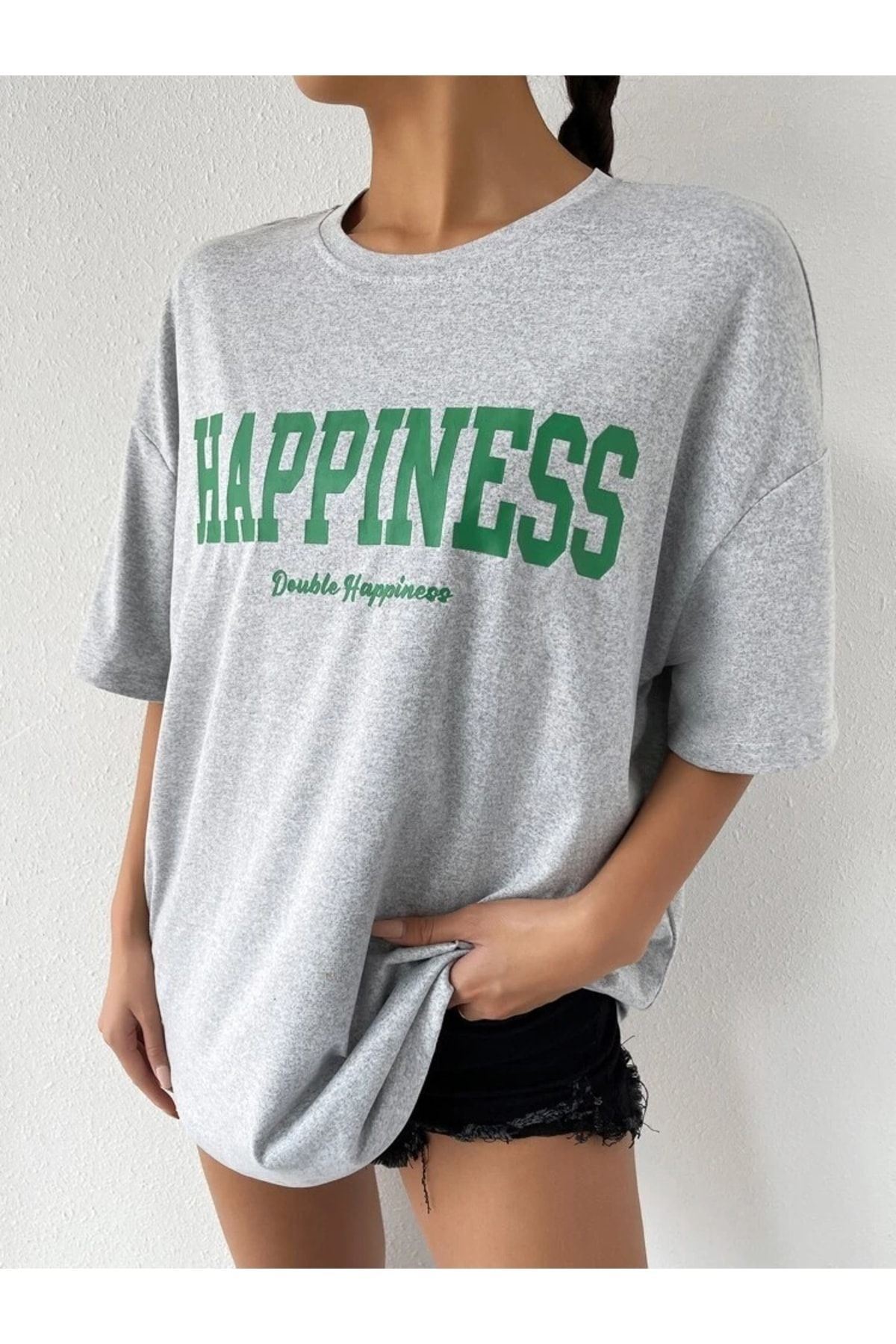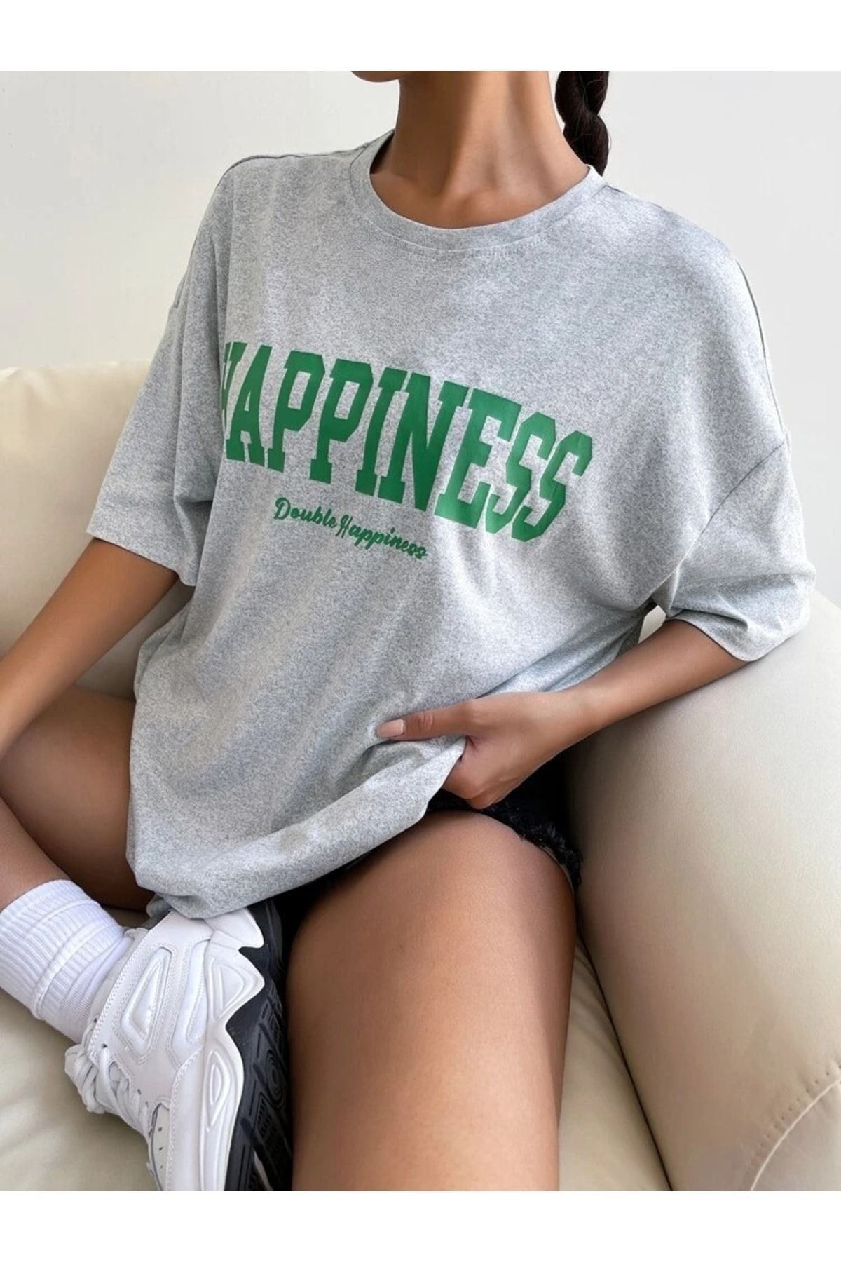 Gri Oversize Happıness Baskılı T-shirt - Oversize Unisex