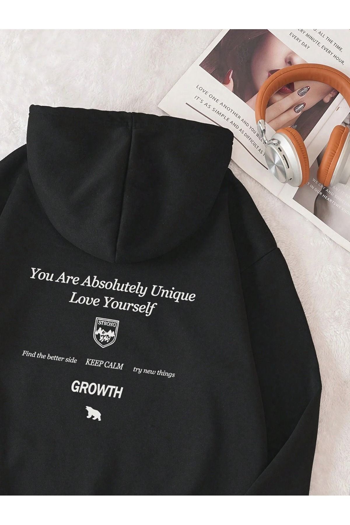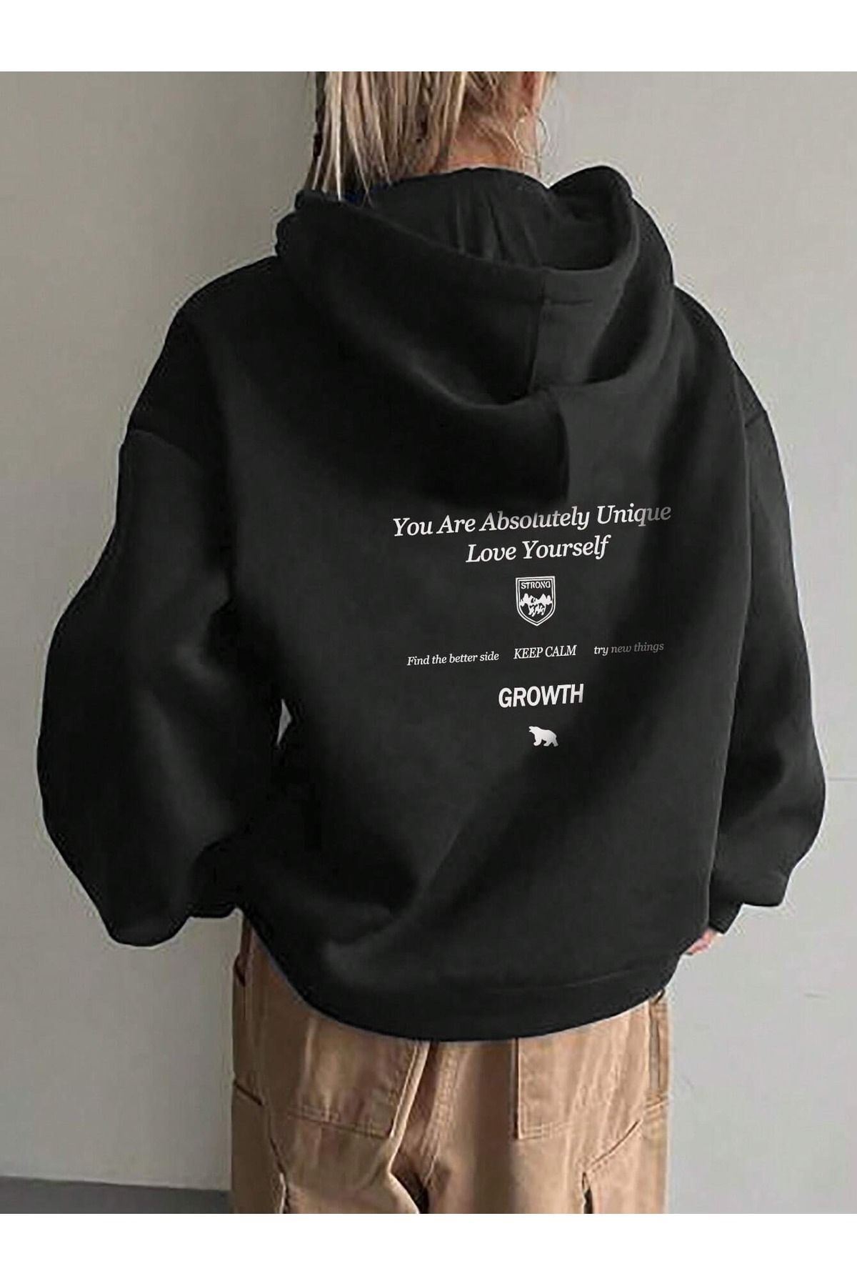 Growth Keep Calm Sweatshirt - Siyah Baskılı Oversize Kalın Kışlık Kapüşonlu
