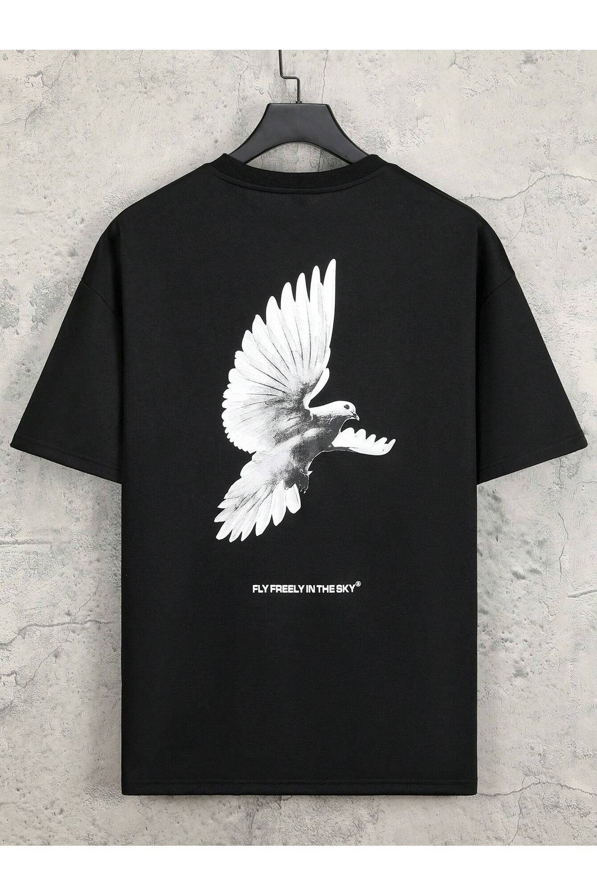 Güvercin Süprem T-Shirt - Siyah Baskılı Oversize Bisiklet Yaka Kısa Kol Tişört