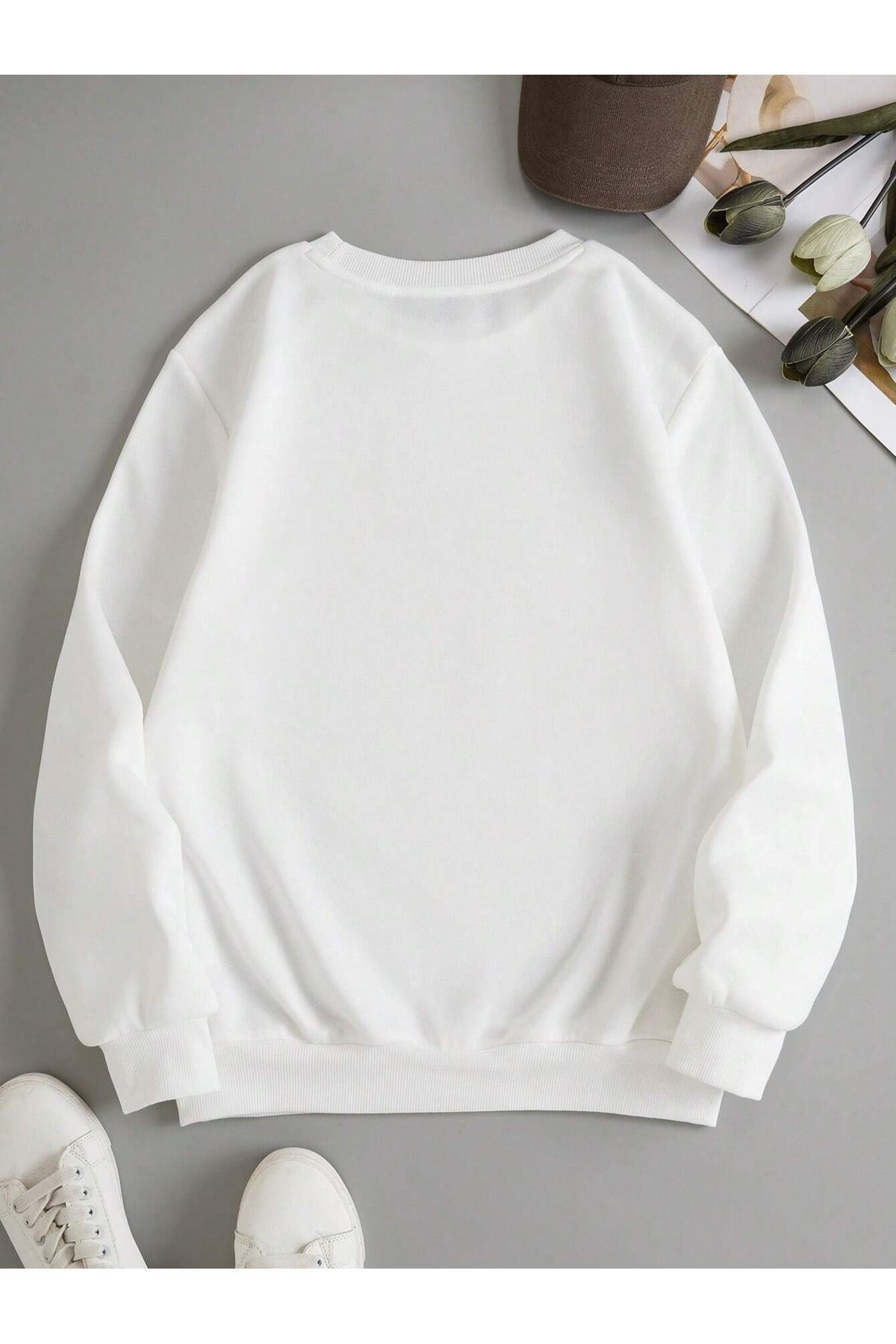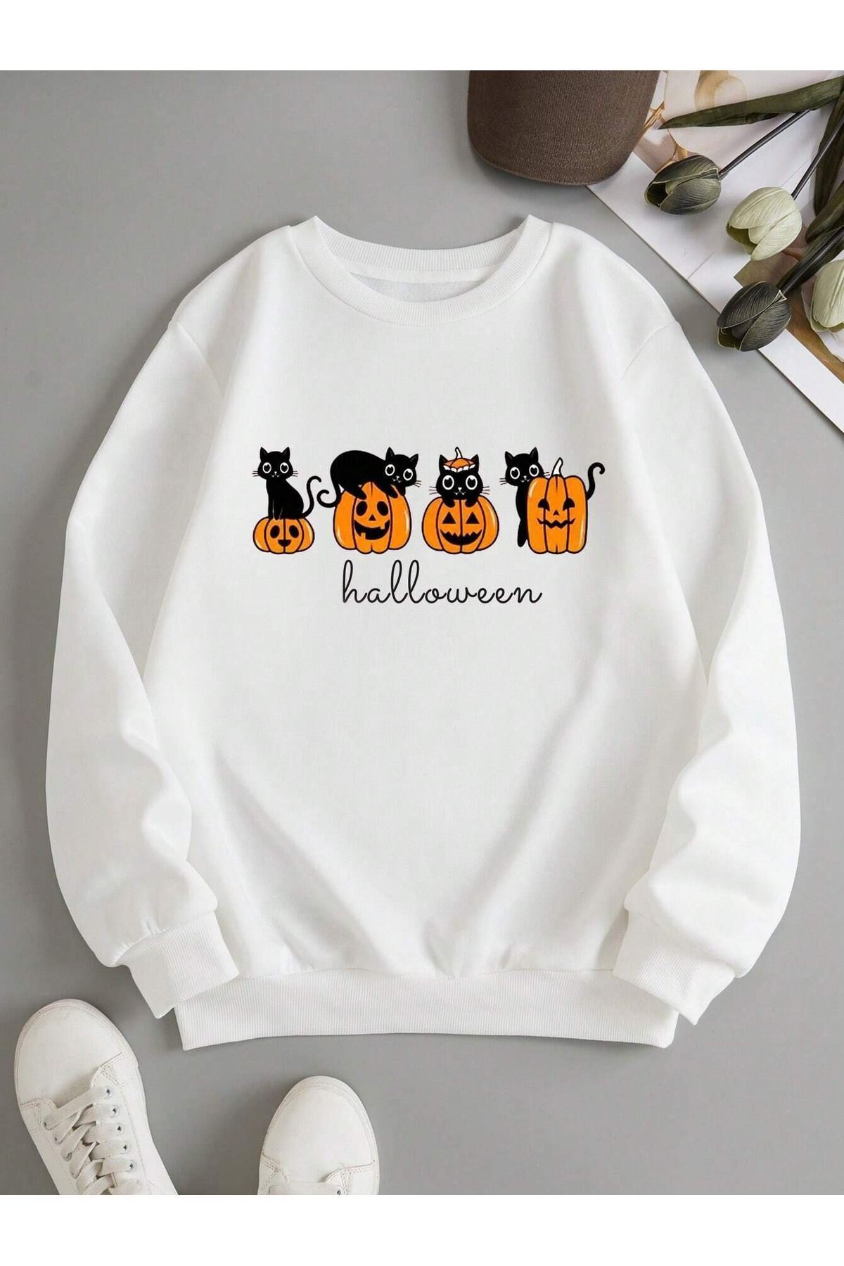 Halloween Kediler Sweatshirt - Beyaz Baskılı Oversize Bisiklet Yaka