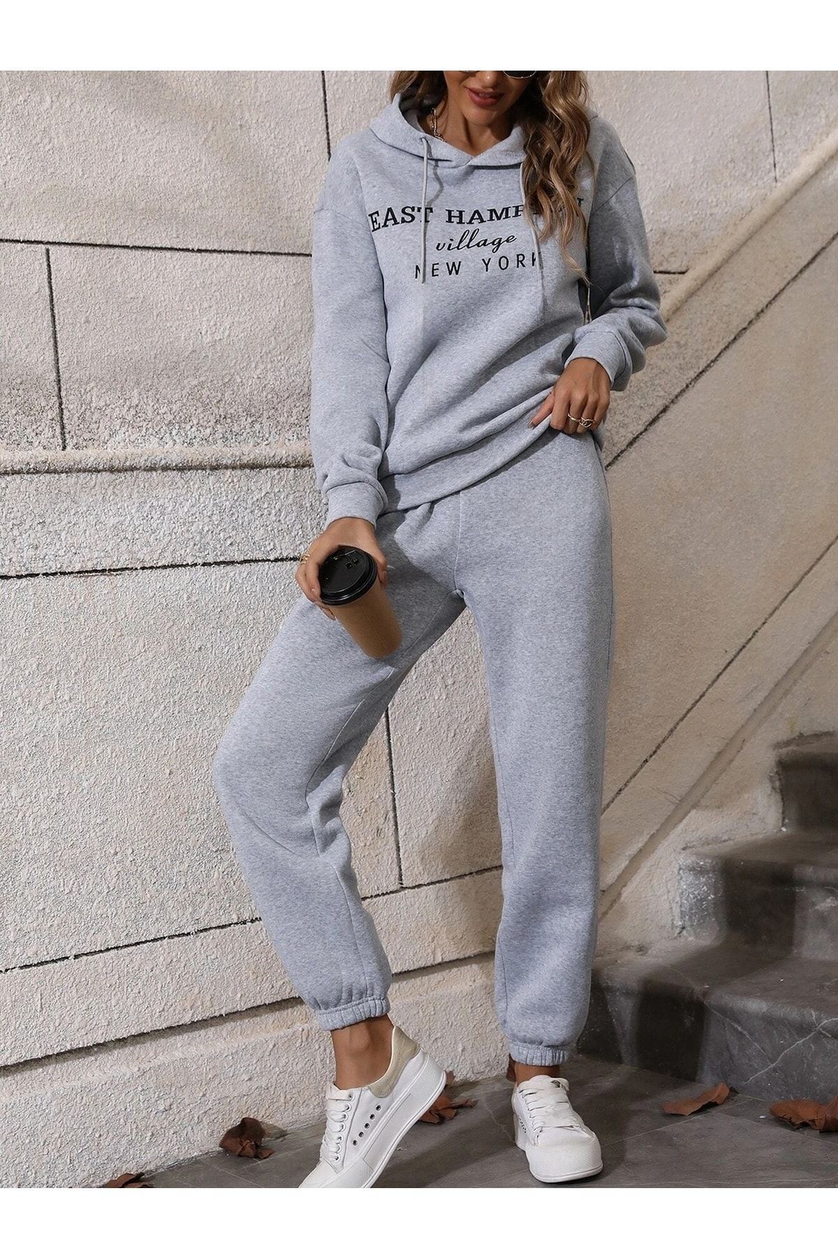 Hampton Eşofman Takımı Sweatshirt Jogger - Gri Baskılı Oversize Şardonlu Kapüşonlu Lastik Paça
