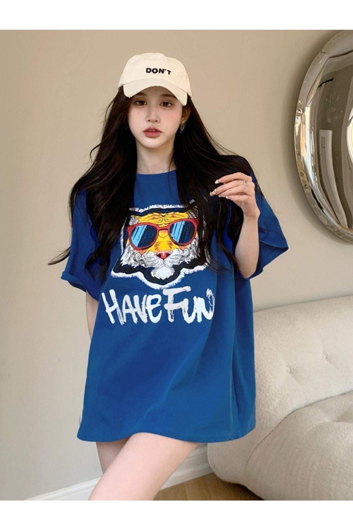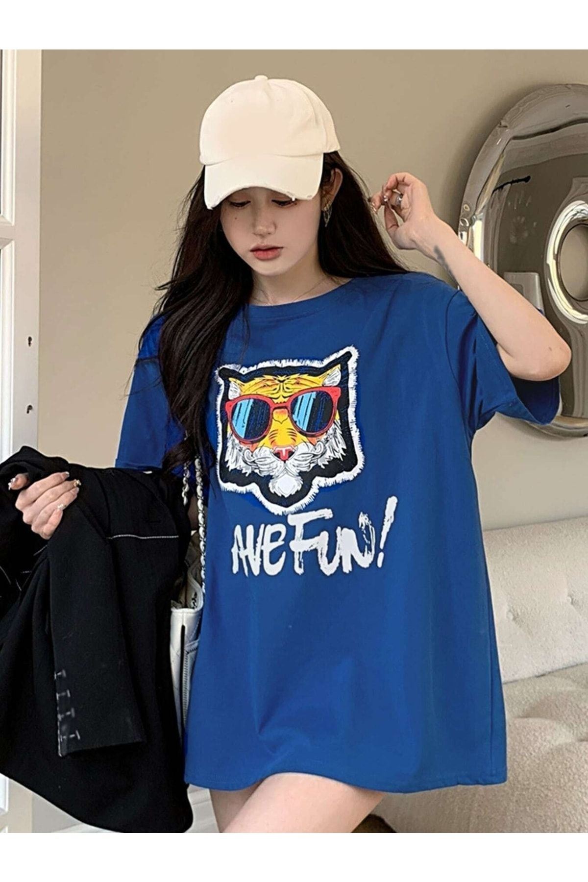 Have Fun Gözlüklü Figür T-shirt -lacivert Baskılı Oversize Bisiklet Yaka Kısa Kol Tişört
