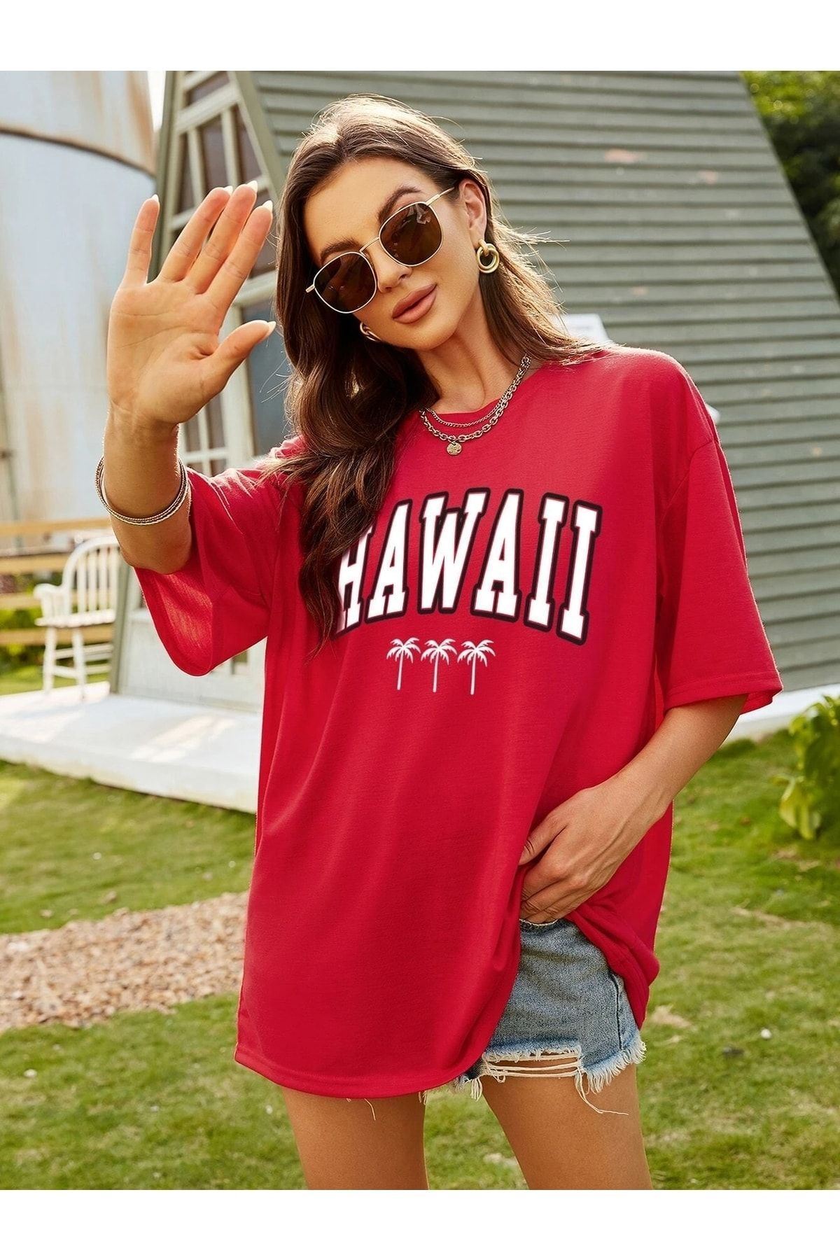 Hawaii T-shirt - Kırmızı Baskılı Oversize Bisiklet Yaka Kısa Kol Tişört