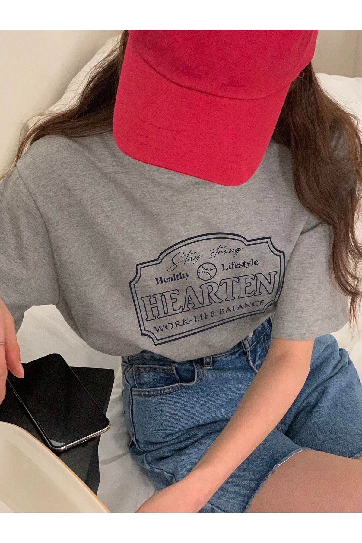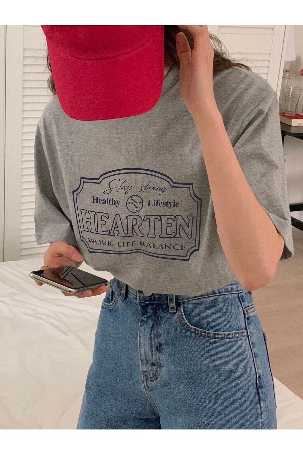Hearten Süprem T-Shirt - Gri Baskılı Oversize Bisiklet Yaka Kısa Kol Tişört