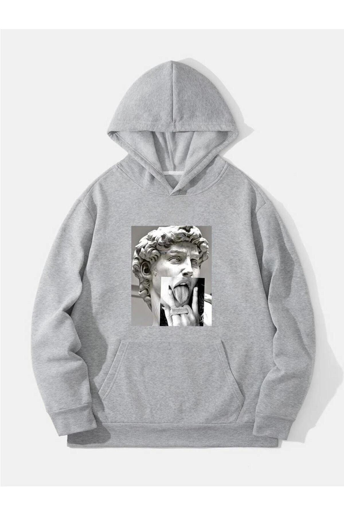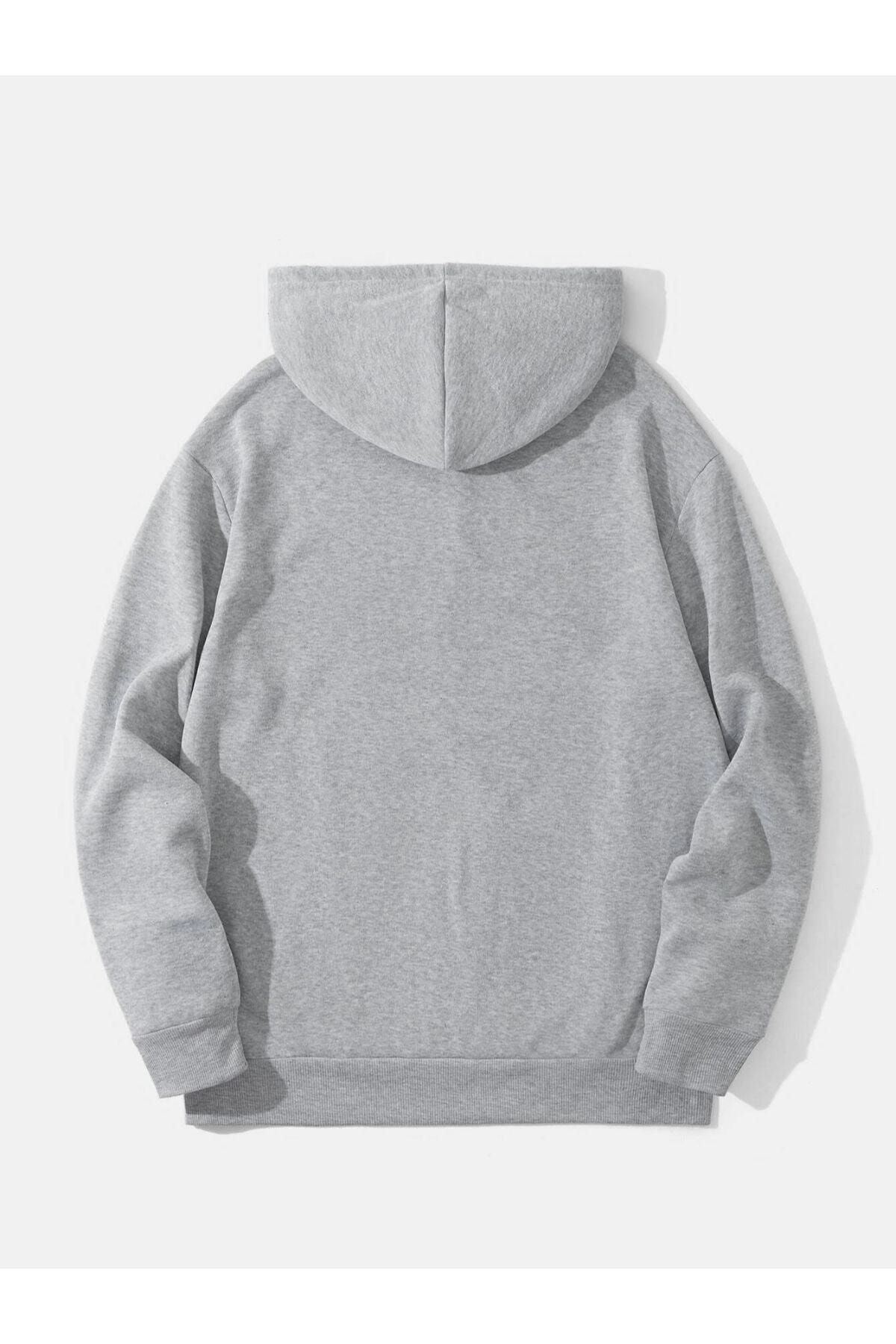 Heykel El Sweatshirt - Gri Baskılı Oversize Kapüşonlu