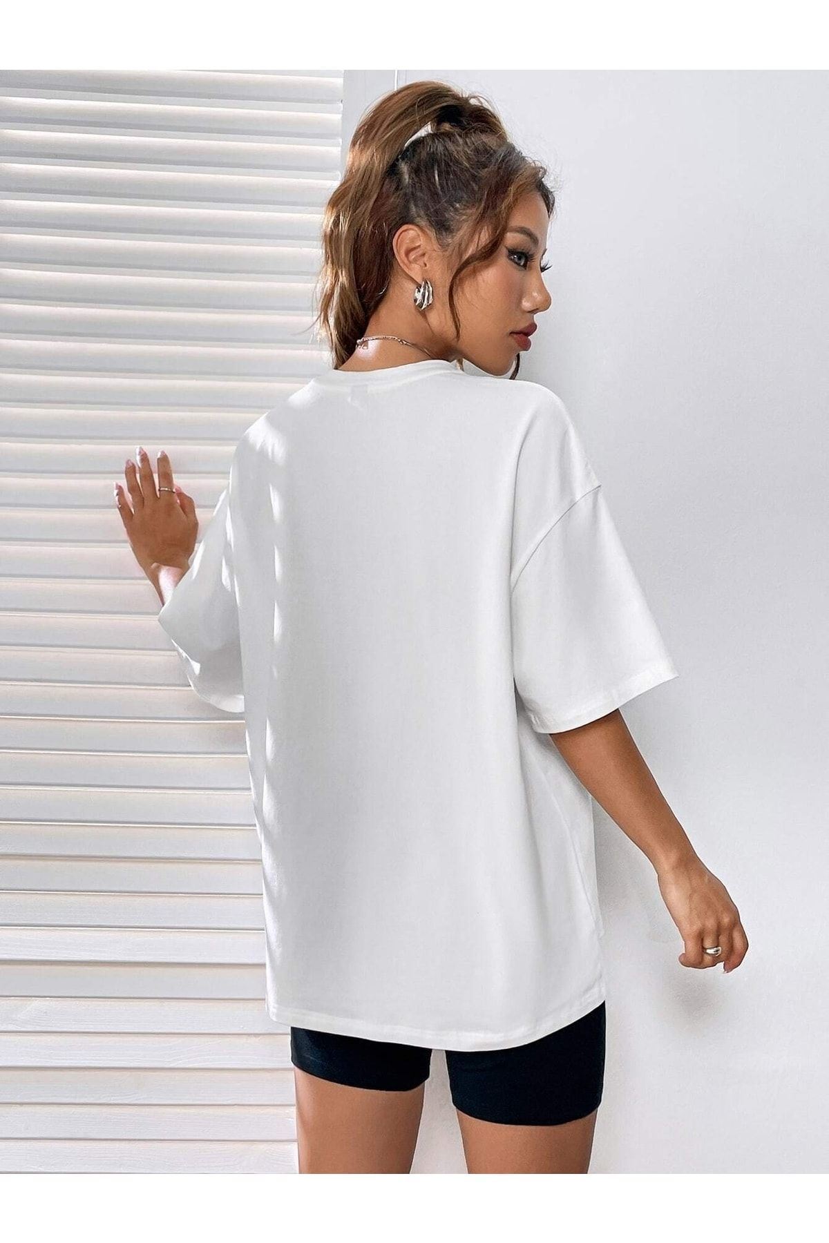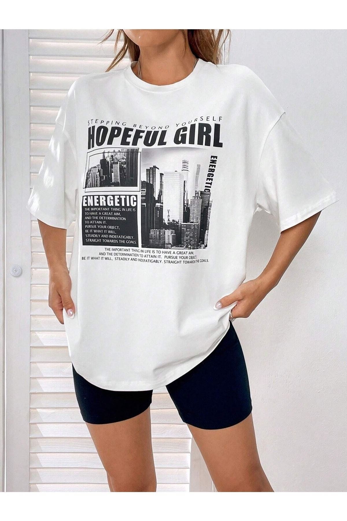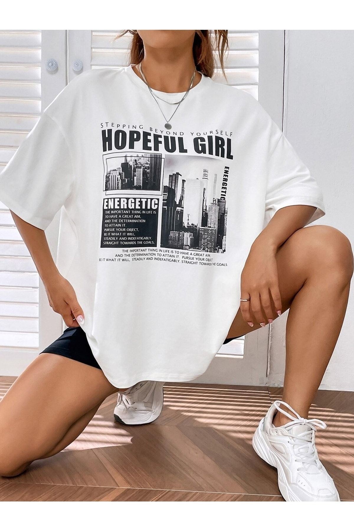 Hopeful Girl T-shirt - Beyaz Baskılı Oversize Bisiklet Yaka Kısa Kol Tişört