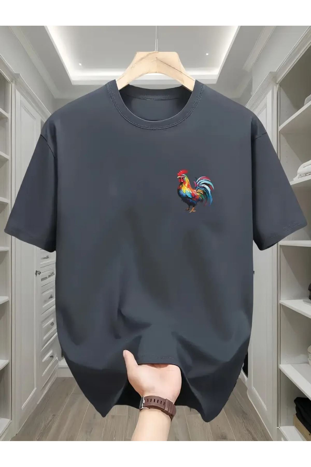 Horoz Baskılı Füme Pamuklu T-Shirt - Oversize Bisiklet Yaka Kısa Kol Tişört