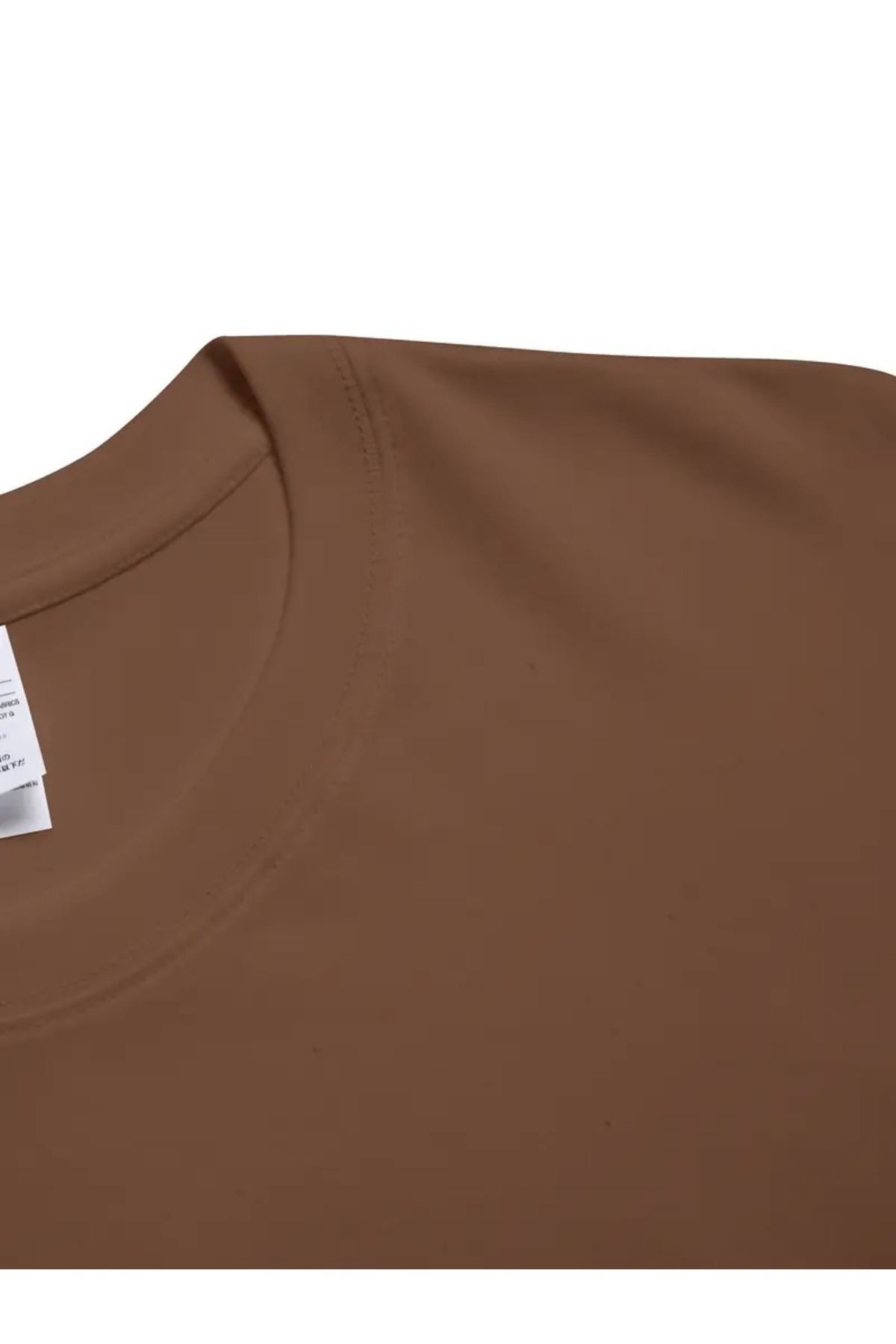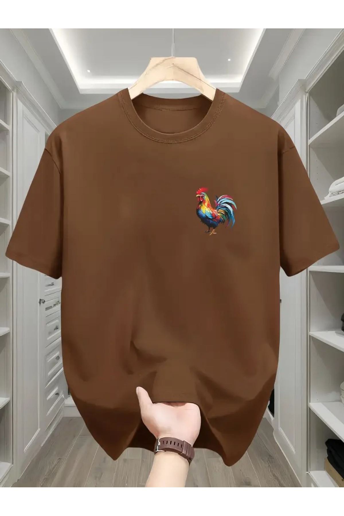 Horoz Baskılı Kahverengi Pamuklu T-Shirt - Oversize Bisiklet Yaka Kısa Kol Tişört