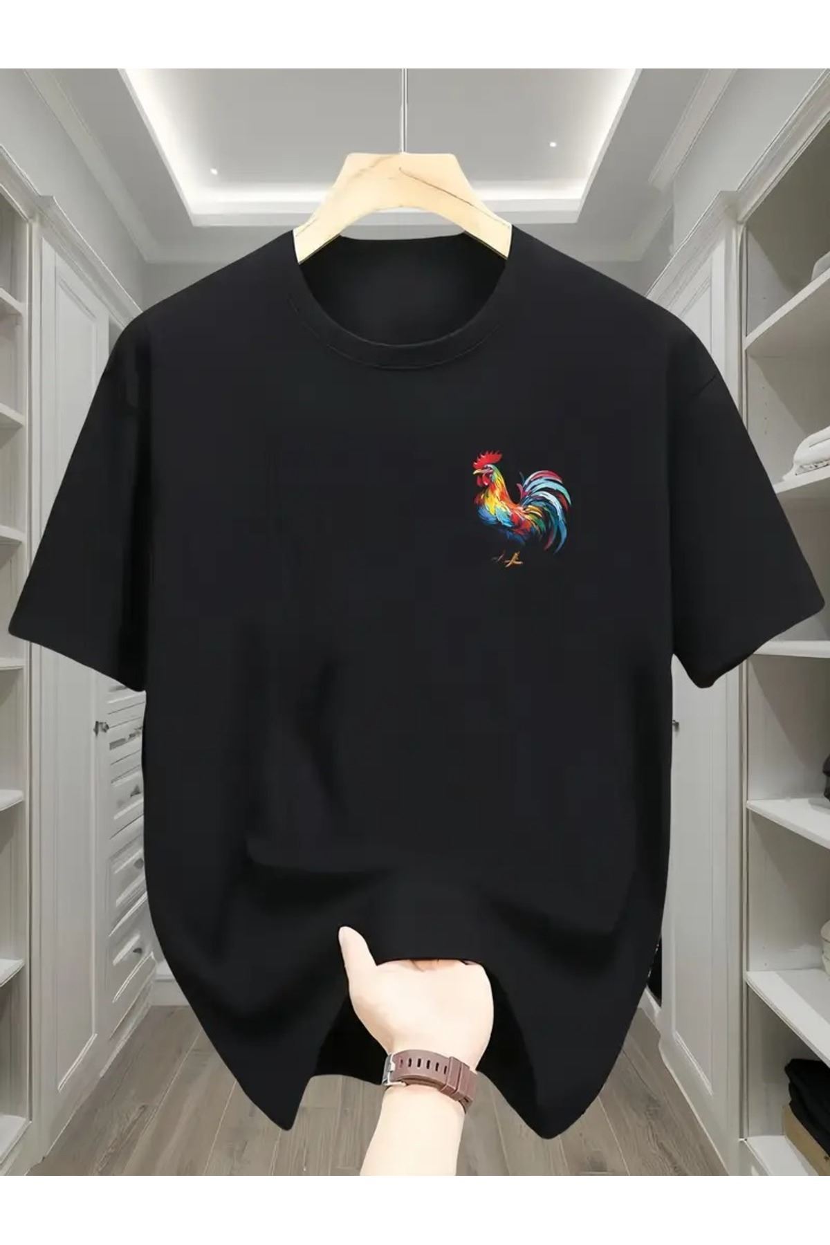 Horoz Baskılı Siyah Pamuklu T-Shirt - Oversize Bisiklet Yaka Kısa Kol Tişört