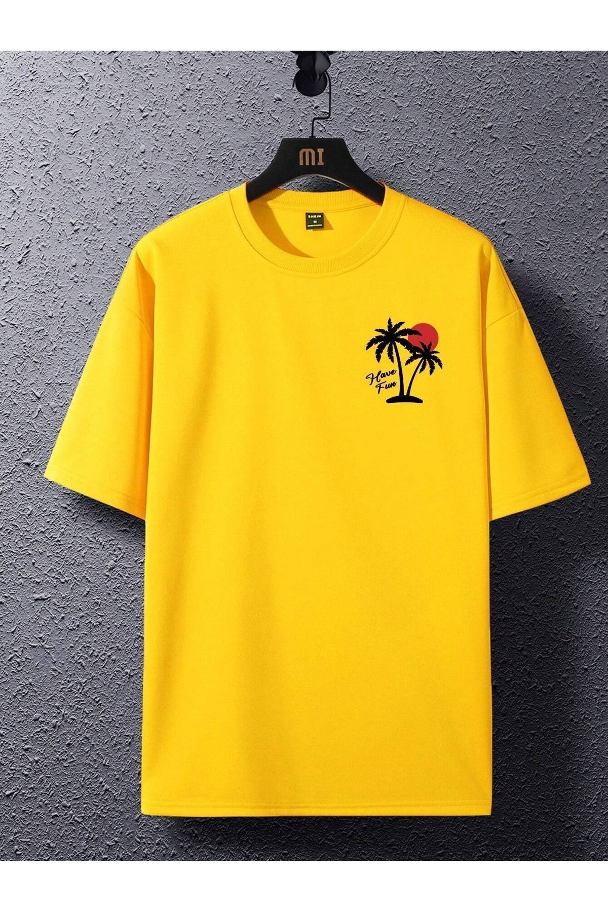 Hve Fun Palmiye Süprem T-Shirt - Sarı Baskılı Oversize Bisiklet Yaka Kısa Kol Tişört