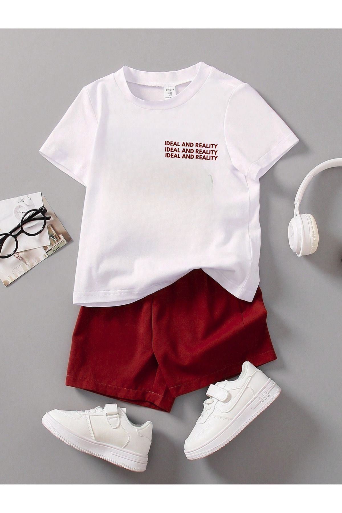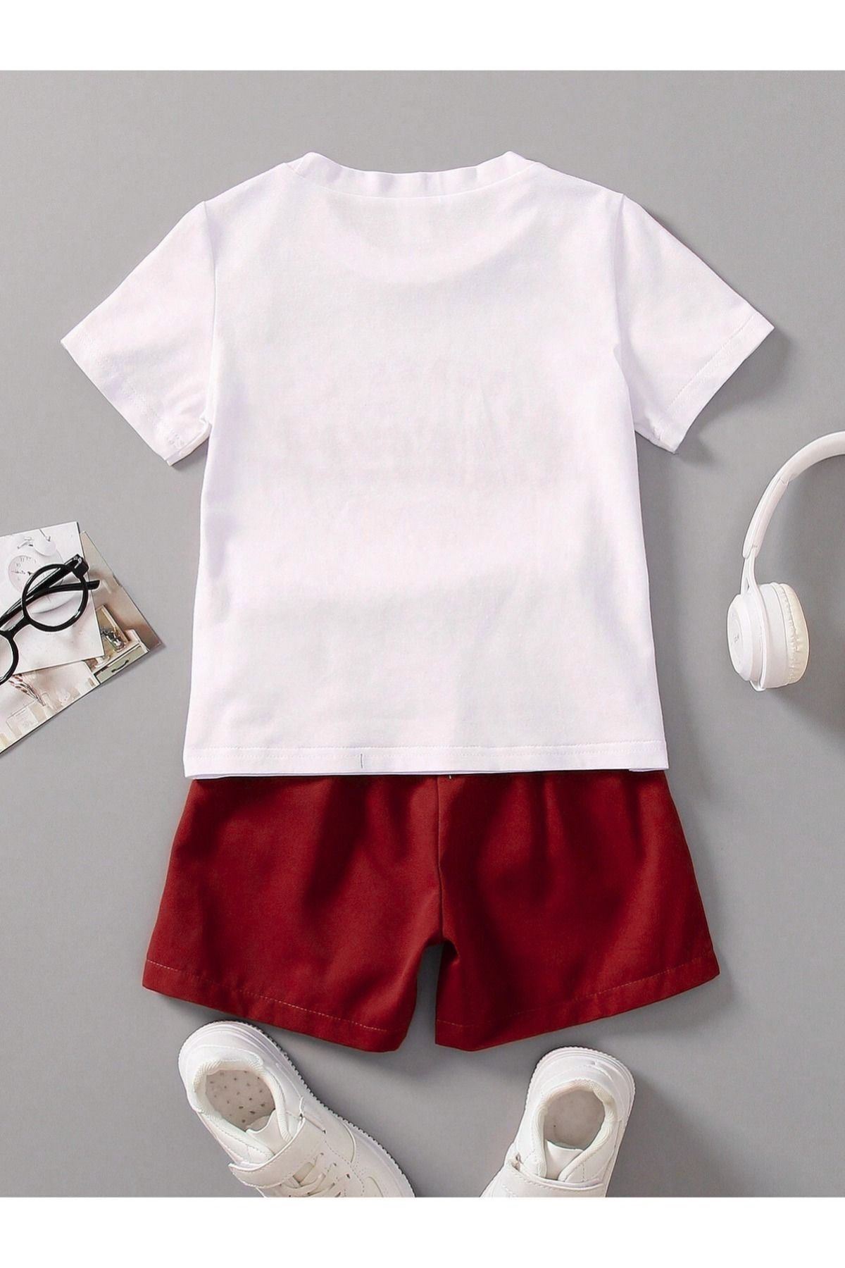 Ideal Pamuklu Çocuk Takım - Beyaz T-shirt Kırmızı Şort Baskılı Kız Erkek Çocuk Yazlık Bisiklet Yaka